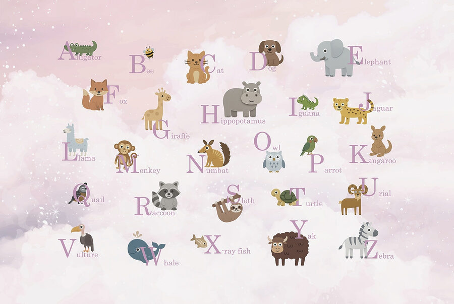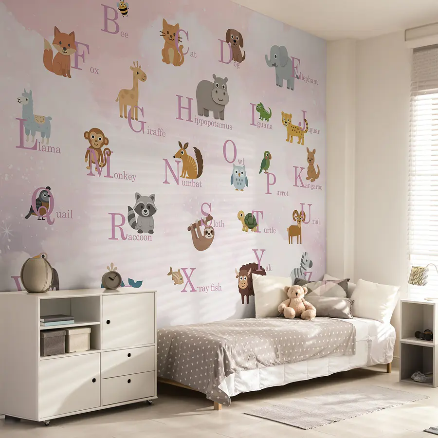 Tover de kinderkamer om in een grillig wonderland met deze prachtige muurschildering met een parade van charmante dieren en de bijbehorende letters. Zie hoe kleine vingertjes de schattige alligator, de bezige bij en de speelse puppy natekenen – het is net een leuke spellingles op de muur!