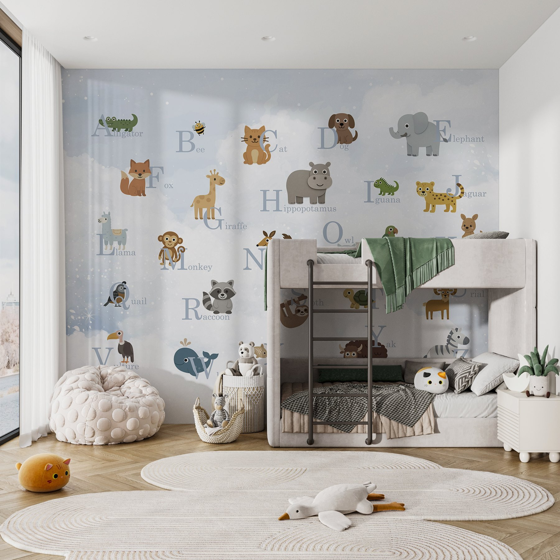 Verander de ruimte van je kind in een levendige jungle van plezier met deze prachtige muurschildering met een cast van charmante dieren en de bijbehorende letters. Het is net een dierentuin en alfabet in één! Stel je een speelse vos, een maffe giraf en een wijze uil voor die een avontuur naar je muren brengen – gegarandeerd om nieuwsgierigheid en gegiechel op te wekken.