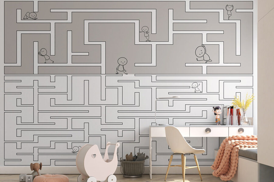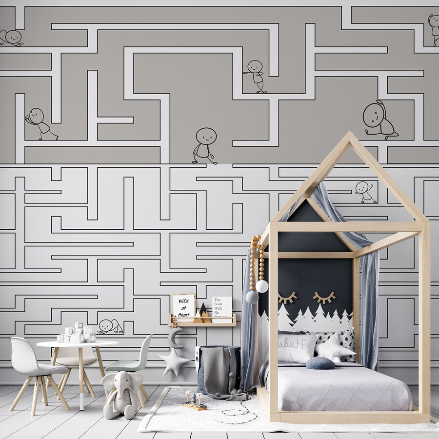 Het leuke ontwerp nodigt uit om op onderzoek uit te gaan, perfect om de kleintjes aan te moedigen hun eigen verhalen te verzinnen of zelfs hun vrienden uit te dagen. Bovendien is het luchtig genoeg om een glimlach op je gezicht te toveren, of je je nu een weg baant door de dagelijkse chaos of gewoon geniet van wat vrije tijd. Het is het soort muurschildering dat van een muur een levendige, speelse reis maakt. Wie zou er niet elke dag door zijn eigen doolhof willen wandelen?