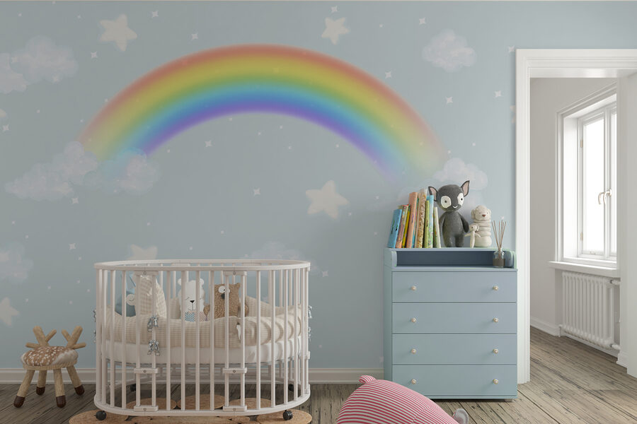 Deze muurschildering ziet er niet alleen goed uit, maar voelt ook magisch aan. Stel je voor dat je je op een regenachtige dag ontspant met warme chocolademelk in je hand, terwijl deze muurschildering voor een frisse wind en een vleugje kleur zorgt. Misschien verdwaal je wel in de serene blauwe achtergrond of verzin je verhalen over de sterren en wolken met je kinderen. Het is vriendelijk, uitnodigend en geeft de kamer meteen een groter en helderder gevoel.