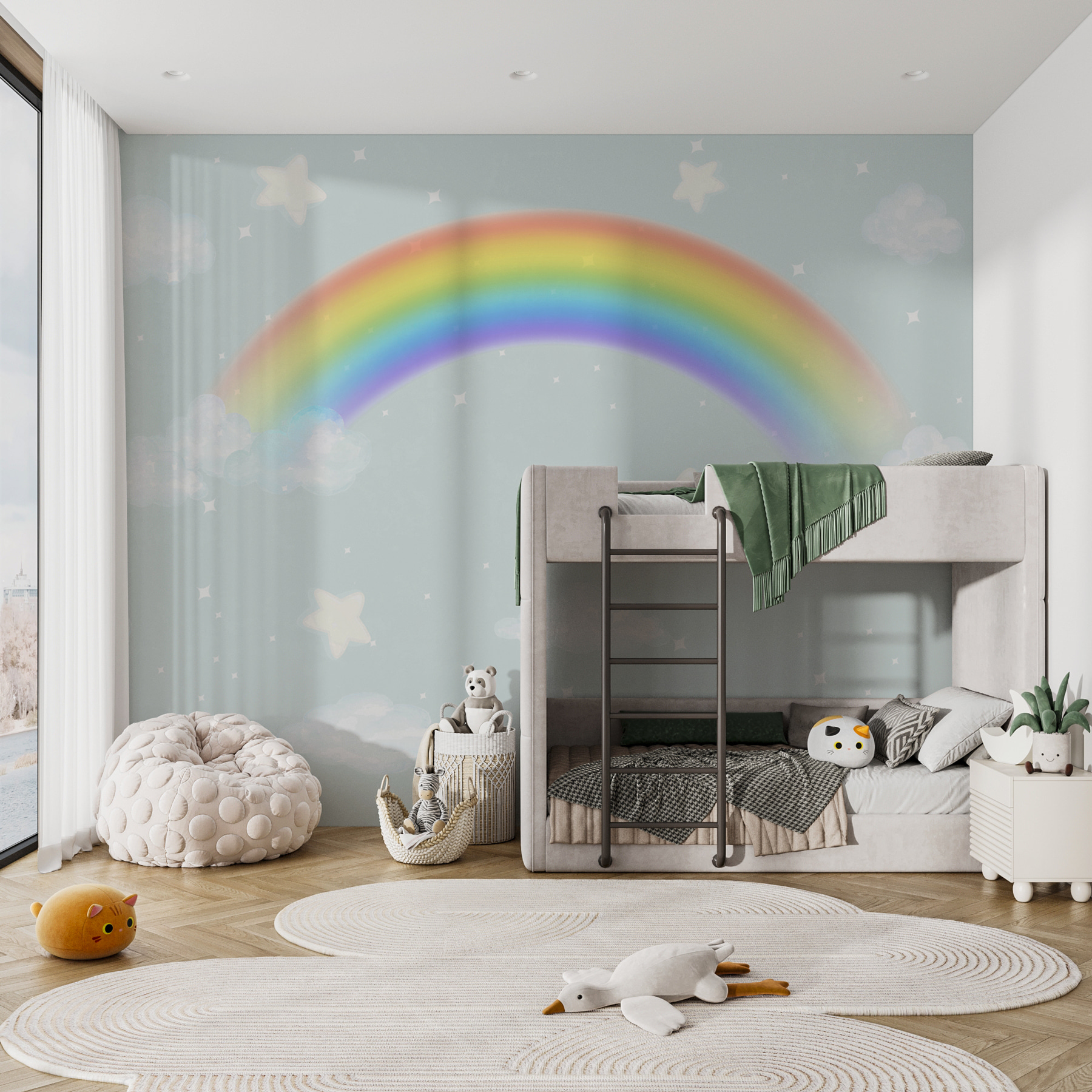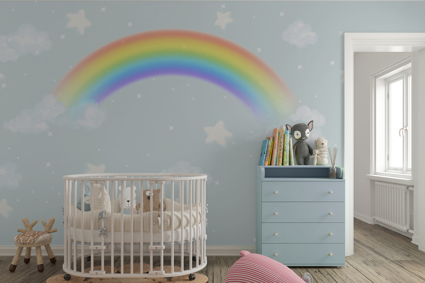Deze muurschildering ziet er niet alleen goed uit, maar voelt ook magisch aan. Stel je voor dat je je op een regenachtige dag ontspant met warme chocolademelk in je hand, terwijl deze muurschildering voor een frisse wind en een vleugje kleur zorgt. Misschien verdwaal je wel in de serene blauwe achtergrond of verzin je verhalen over de sterren en wolken met je kinderen. Het is vriendelijk, uitnodigend en geeft de kamer meteen een groter en helderder gevoel.