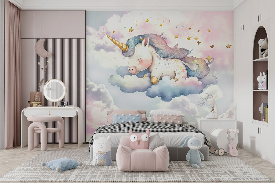 Kijk eens naar deze dromerige muurschildering “Unicorn Sleeping on Clouds”! Echt, het is net alsof je in een pluizige, magische dagdroom stapt telkens als je de kamer binnenloopt. Stel je voor dat je favoriete knusse plekje nu voorzien is van een superschattige, snurkende eenhoorn op zachte, gezwollen wolken – wat een sfeer, toch? Perfect om een vleugje magie toe te voegen aan een kinderkamer of zelfs aan je eigen leeshoekje.