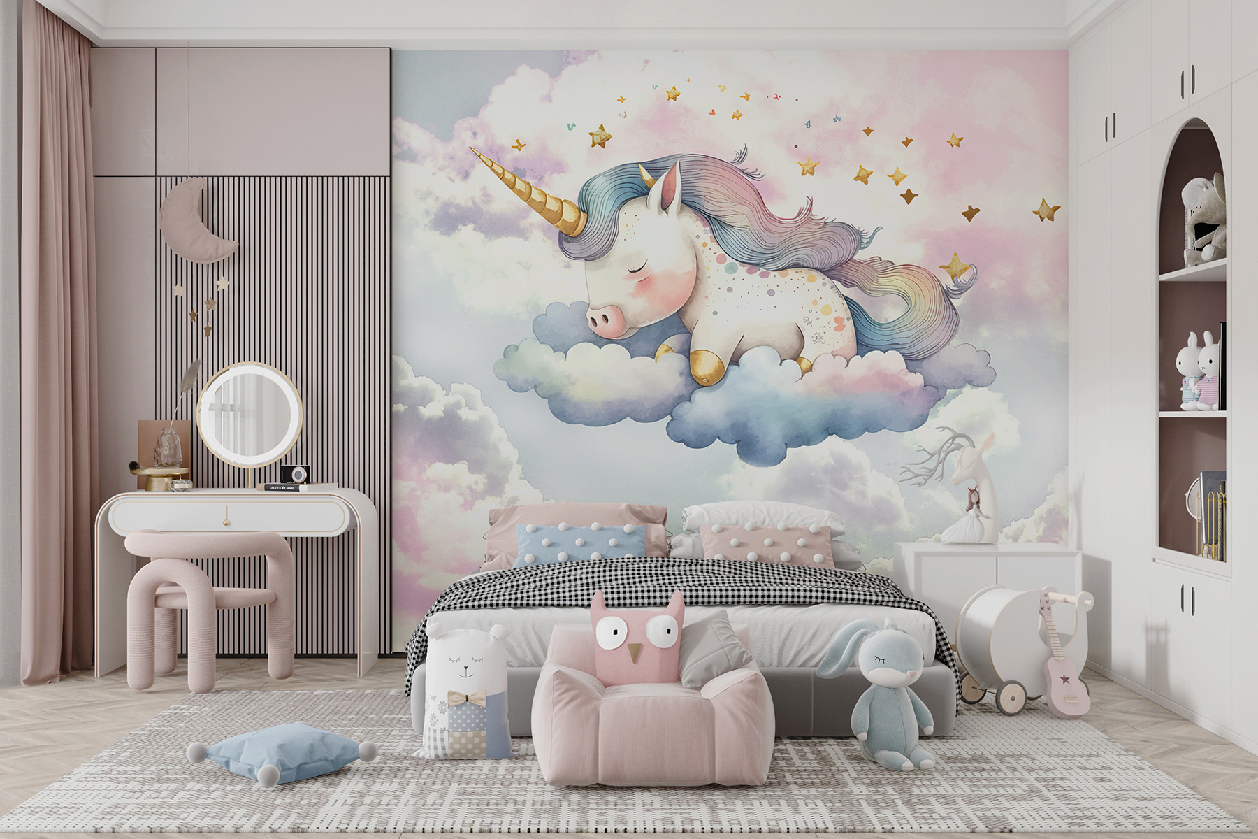 Kijk eens naar deze dromerige muurschildering “Unicorn Sleeping on Clouds”! Echt, het is net alsof je in een pluizige, magische dagdroom stapt telkens als je de kamer binnenloopt. Stel je voor dat je favoriete knusse plekje nu voorzien is van een superschattige, snurkende eenhoorn op zachte, gezwollen wolken – wat een sfeer, toch? Perfect om een vleugje magie toe te voegen aan een kinderkamer of zelfs aan je eigen leeshoekje.