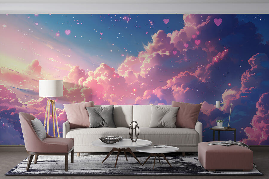 Stel je voor dat je naar boven kijkt en een lucht ziet vol dromerige, roze getinte wolken die eruit zien alsof ze rechtstreeks uit een sprookje komen – deze muurschildering, “Fotobehang w01487”, is dat magische tafereel vastgelegd voor je muur. Het is alsof je een stukje suikerspinhemel in huis haalt. Perfect voor wie houdt van een vleugje eigenzinnigheid en een vleugje sereniteit overdag. De zachte blauwe en roze tinten smelten samen en geven elke kamer een knus en verfrissend gevoel. Kinderen zullen dol zijn op de hartvormige accenten en het zou zomaar eens de conversatiestarter kunnen zijn op je volgende bijeenkomst. Het is niet zomaar een muurschildering; het is een stukje geluk aan je muur.
