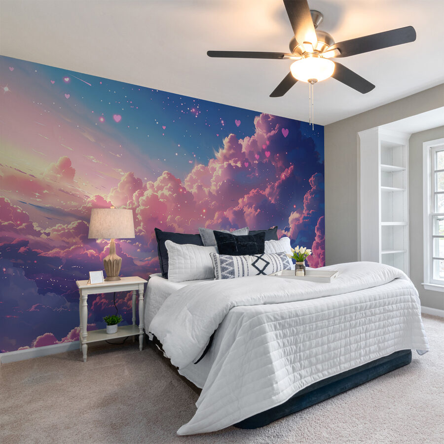 Stel je voor dat je naar boven kijkt en een lucht ziet vol dromerige, roze getinte wolken die eruit zien alsof ze rechtstreeks uit een sprookje komen – deze muurschildering, “Fotobehang w01487”, is dat magische tafereel vastgelegd voor je muur. Het is alsof je een stukje suikerspinhemel in huis haalt. Perfect voor wie houdt van een vleugje eigenzinnigheid en een vleugje sereniteit overdag. De zachte blauwe en roze tinten smelten samen en geven elke kamer een knus en verfrissend gevoel. Kinderen zullen dol zijn op de hartvormige accenten en het zou zomaar eens de conversatiestarter kunnen zijn op je volgende bijeenkomst. Het is niet zomaar een muurschildering; het is een stukje geluk aan je muur.