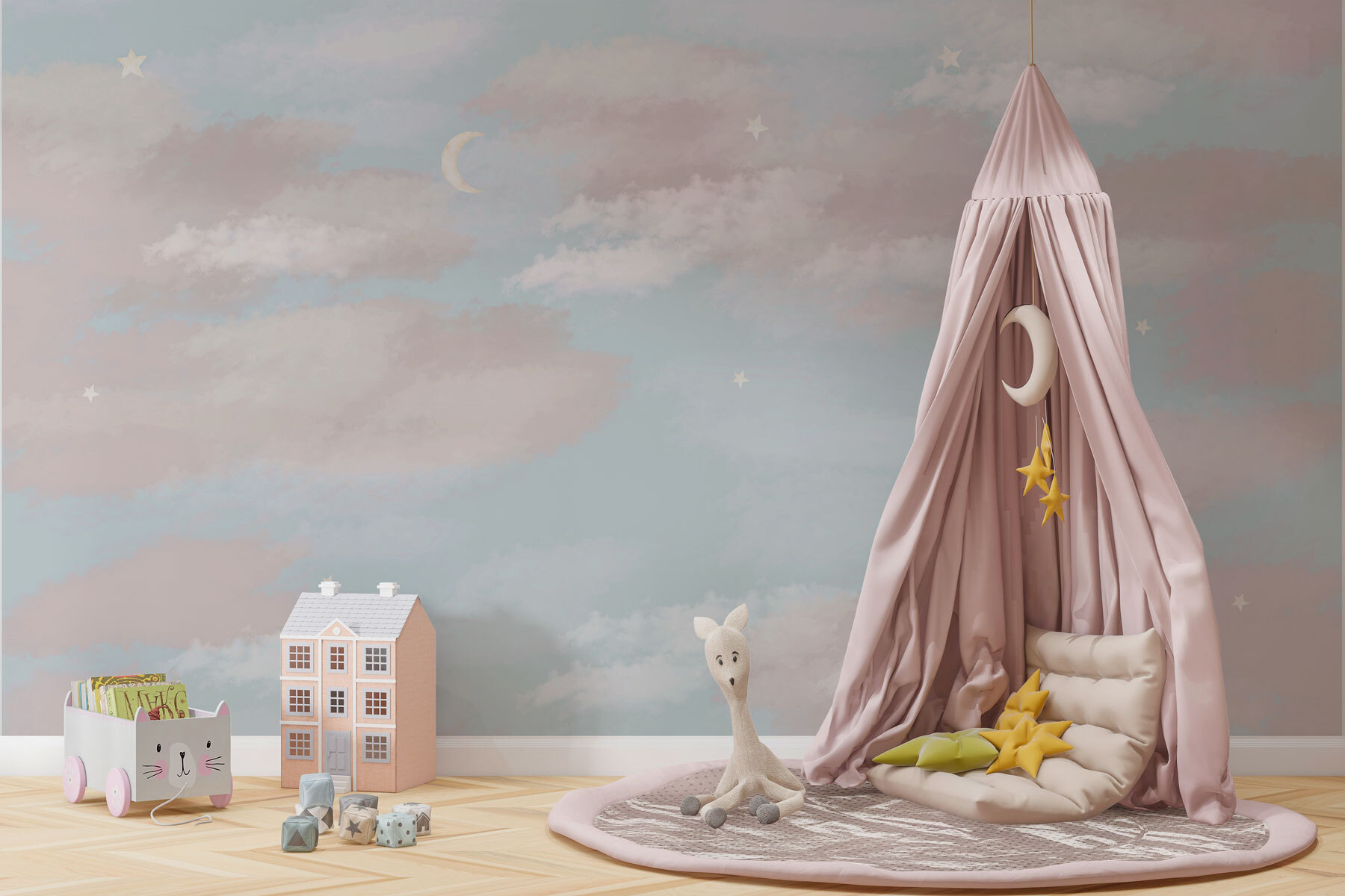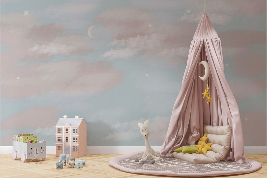 Stel je voor dat je op je bank ligt en naar een perfecte hemel staart – zonder insecten en onvoorspelbaar weer. Deze “Muurschildering: Blauwe Lucht met Wolken en Halve Maan” brengt een serene sfeer binnenshuis en verandert een alledaagse muur in een dagdroomdoek. Pluizige wolken drijven lui rond, een maansikkel voegt een vleugje magie toe en de zachte blauwe tint? Het fluistert bijna “relax”. Perfect voor elke ruimte die verlangt naar rust en charme. Vrienden zullen je vragen of je naar buiten bent verhuisd. Ga je gang, verwen je muren!