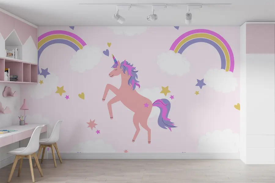 Tover elke ruimte om in een grillig wonderland met deze betoverende muurschildering met een schattige eenhoorn die danst tussen regenbogen en pluizige wolken. Stel je voor dat je een kamer binnenloopt die gevuld is met een vleugje magie – elke blik onthult dromerige kleuren en charmante sterren die een glimlach op je gezicht toveren. Perfect voor een kinderkamer of een speelse woonkamer, deze muurschildering nodigt iedereen uit om hun innerlijke kind te omarmen. Het is alsof je een sprookje aan de muur hebt hangen, dat elke dag vreugde en verbeelding opwekt. Wie wil er nu geen eenhoornfeestje telkens als hij langsloopt? Omarm de eigenzinnigheid!