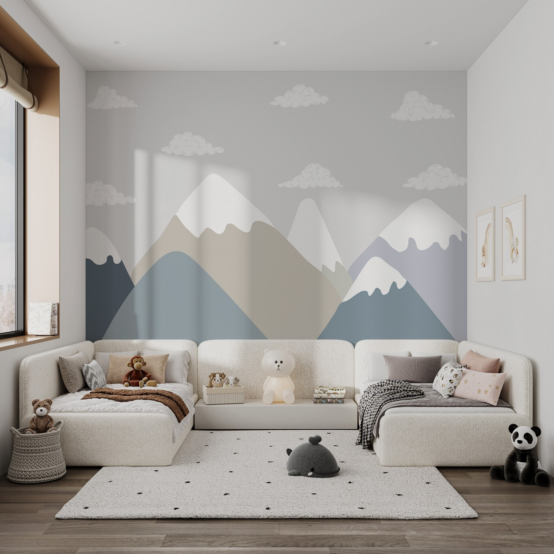 Transformeer je ruimte met deze prachtige muurschildering met vredige bergketens en pluizige wolken die voorbij drijven. Stel je voor dat je een kamer binnenloopt die aanvoelt als een frisse wind – een koele ontsnapping aan de dagelijkse sleur. De zachte blauwe en beige tinten nodigen uit tot sereniteit, waardoor het perfect is voor een gezellige leeshoek of een rustige slaapkamer. Stel je voor dat je lekker wegkruipt met een goed boek en verdwaalt in de schoonheid van de natuur zonder je huis te verlaten. Het is alsof je je eigen stukje buiten hebt, zonder de insecten. Tijd om die muren het woord te laten doen!