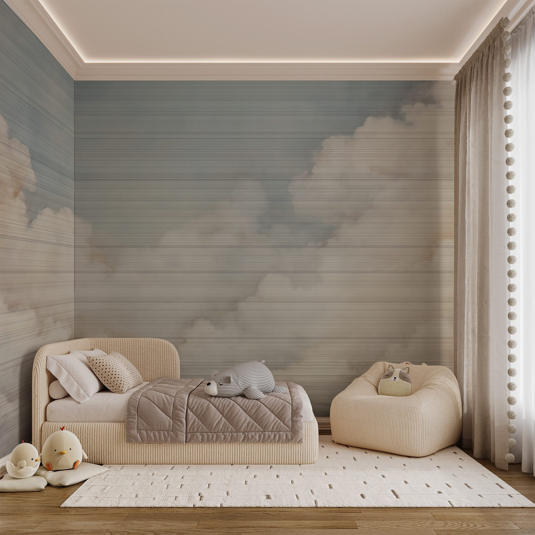 Verander elke ruimte in een sereen toevluchtsoord met deze muurschildering van pluizige witte wolken tegen een zachtblauwe lucht. Het is alsof je een stukje van het buitenleven naar binnen haalt, zonder risico op regen! Stel je voor dat je in een comfortabele stoel zit, koffie in de hand, terwijl je naar deze dromerige wolken staart. Ze fluisteren ontspanning in, vind je niet? Deze muurschildering is perfect voor een gezellige woonkamer of een rustige slaapkamer en nodigt uit tot dagdromen en een vredig gevoel. Wie wil er nu niet af en toe wegzweven in de wolken? Het is een verfrissende kijk op muurkunst die licht en toch o zo uitnodigend aanvoelt.