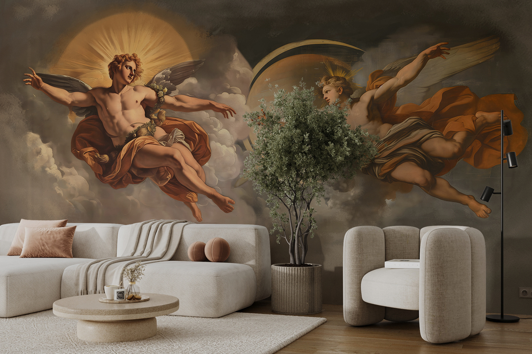 Stap in een wereld vol wonderen met de “Fotobehang w08137”. Stel je voor dat je elke ochtend wakker wordt onder de hemelse gloed van deze prachtige muurschildering – het is alsof je een stukje hemel in huis hebt! Met adembenemende daglicht tinten en dromerige wolken, combineert het moeiteloos klassieke kunst met moderne magie. Stel je twee figuren voor die door tijd en ruimte heen reiken, hun krachtige en serene aanwezigheid brengt een gevoel van vrede en ontzag.