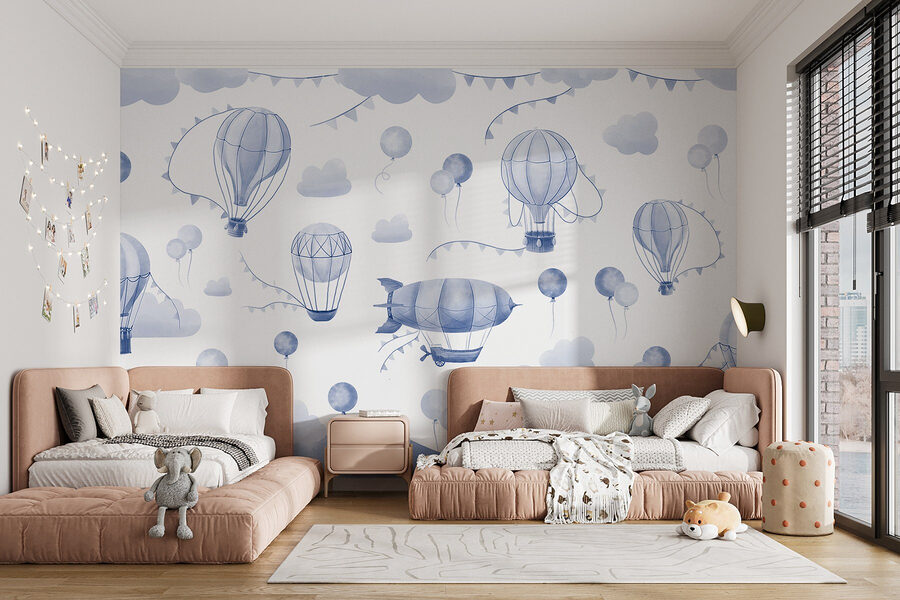 Stel je voor dat je wakker wordt met een zachte zee van wolken en grillige heteluchtballonnen die langs je muren zweven. Deze muurschildering, met een speelse reeks blauwtinten, nodigt uit tot dagdromen over zweven boven majestueuze bergen. Het is alsof je meteen op vakantie bent, zonder dat je je koffers hoeft uit te pakken. Perfect voor een gezellige kinderkamer of een creatieve werkruimte, het voegt een vleugje rust en inspiratie toe. Stel je voor dat kinderen naar elke ballon wijzen en giechelen terwijl ze verhalen verzinnen over waar ze naartoe gaan. Wie weet neemt een ervan hen mee op avontuur! Deze muurschildering is gewoon een verademing voor elke ruimte.