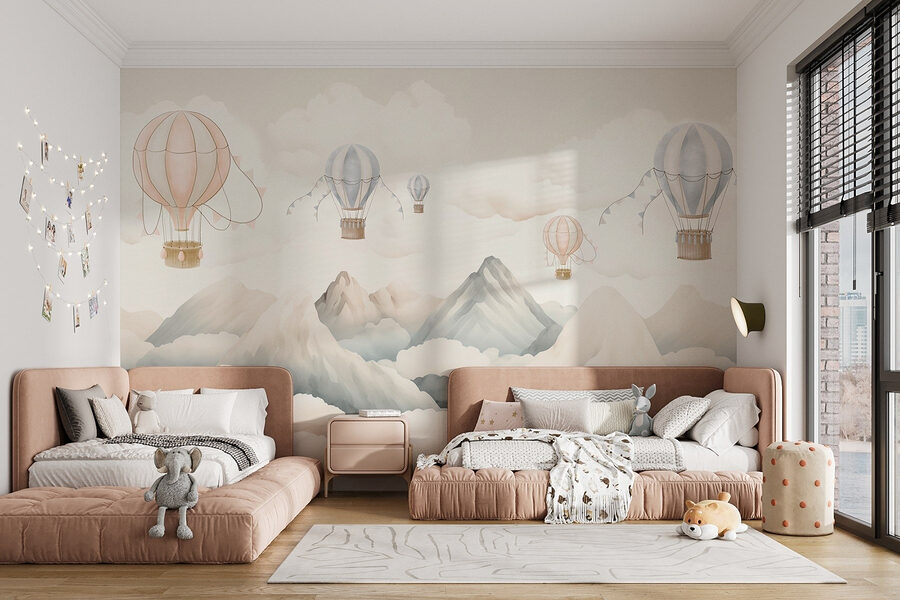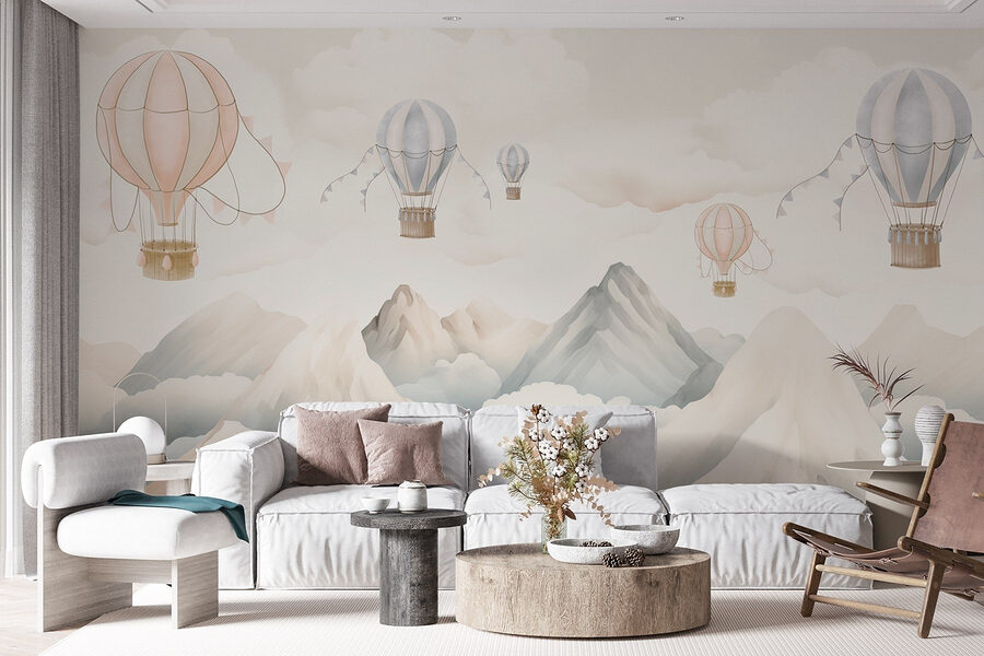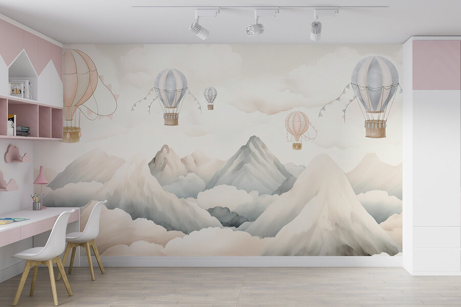 Stel je voor dat je in een wereld stapt waar heteluchtballonnen lui boven majestueuze bergen zweven, omringd door zachte, opbollende wolken. Deze muurschildering brengt een serene sfeer in elke ruimte, alsof je uit een raam naar een dromerig landschap staart. Stel je een gezellig hoekje voor waar je ‘s ochtends aan je koffie nipt en je geïnspireerd voelt door het avontuur dat achter je muren wacht. De zachte pastelkleuren nodigen uit tot warmte en rust, perfect voor een kinderkamer of een ontspannen woonruimte. Het is het soort muurschildering dat dagdromen aanwakkert en je uitnodigt om te genieten van de eenvoudige geneugten van het leven, zoals wegzweven naar de hemel.