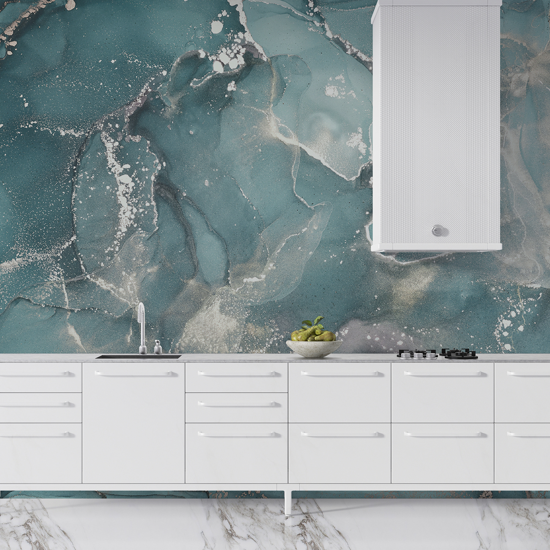 Stel je voor: een luie zondagochtend, koffie in de hand, loungen in een ruimte die aanvoelt als een oase… en dat allemaal dankzij deze adembenemende muurschildering. “Abstract Teal and White Fluid Art” is niet alleen een muurschildering, het is een hele vibe. De wervelingen van groenblauw, witte tinten en gemarmerde texturen creëren een rustgevende, bijna droomachtige sfeer die elke kamer transformeert. Het is alsof je een kunstwerk binnenstapt telkens als je de ruimte betreedt. Deze muurschildering is perfect voor iedereen die op zoek is naar een vleugje uniciteit in zijn of haar interieur en maakt een stoer statement zonder te schreeuwen. Het is verfijnd, maar toch speels – ideaal voor wie houdt van een vleugje elegantie gemengd met een vleugje eigenzinnigheid. Of het nu de woonkamer, slaapkamer of zelfs een creatieve studio is, deze muurschildering verandert gewone muren in buitengewone doeken.
