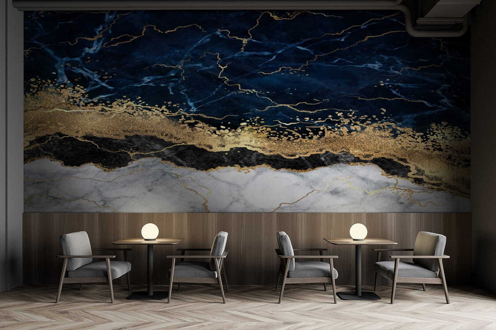 Verander een saaie muur in iets heel boeiends met deze muurschildering, Midnight Marbled with Shimmering Veins. Stel je eens voor dat je een kamer binnenstapt waar diepe blauwtinten door elkaar wervelen als de zee bij middernacht, met aderen die lijken te pulseren en dansen. Het is alsof je een stukje natuur om je ruimte hebt gewikkeld, met een rustgevende maar opvallende sfeer.