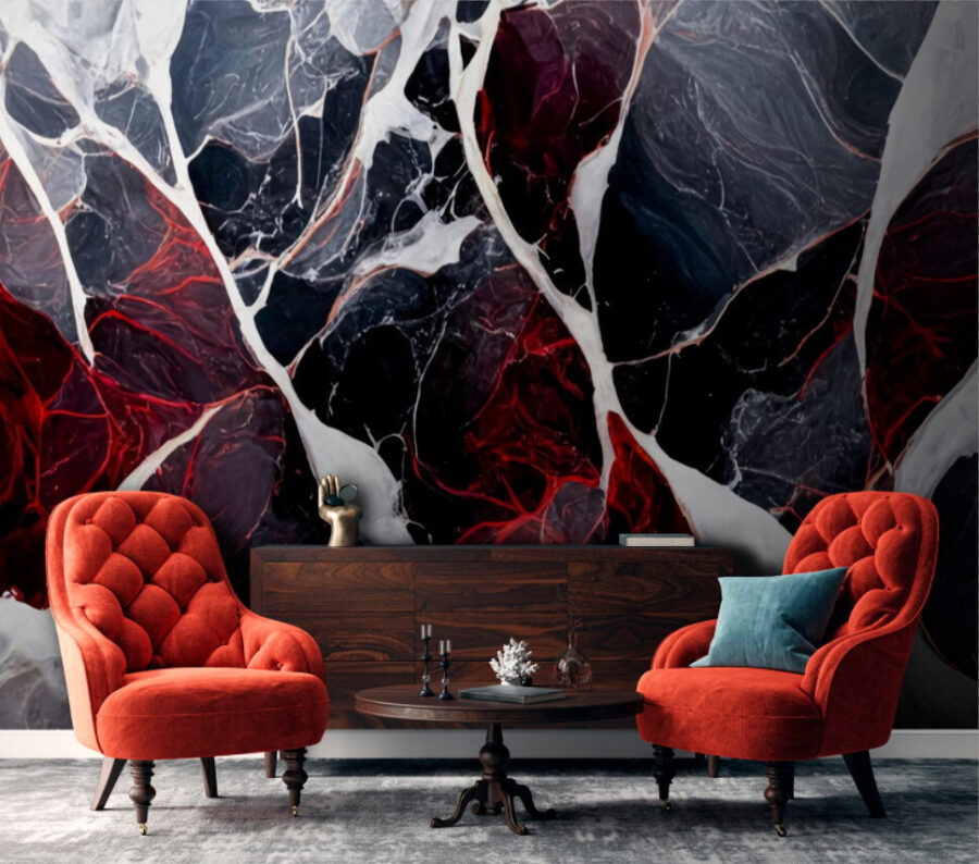 Ooit gedacht dat je muur meer kon zijn dan gewoon, je weet wel, een muur? Laat me je voorstellen aan dit rode en zwarte meesterwerk. Het is alsof je een abstract kunstwerk in je woonkamer hebt, alleen hoef je er niet chique over te doen. Deze muurschildering mengt diep zwart, rokerig grijs en vurig rood op een manier die schreeuwt “Ik ben veel cooler dan een geschilderde muur”. Stel je dit eens voor: je komt thuis na een lange dag en in plaats van saai beige word je begroet door dit gedurfde ontwerp dat je energie geeft en troost tegelijk. Het heeft die dramatische marmeren flair zonder het kille tintje – perfect voor knusse hoekjes of die opvallende muur die een beetje meer… oomph nodig heeft. Maak van je ruimte een galerie of gewoon een plek waar gesprekken vanzelf beginnen. Ga je gang, verdwaal in de diepte!