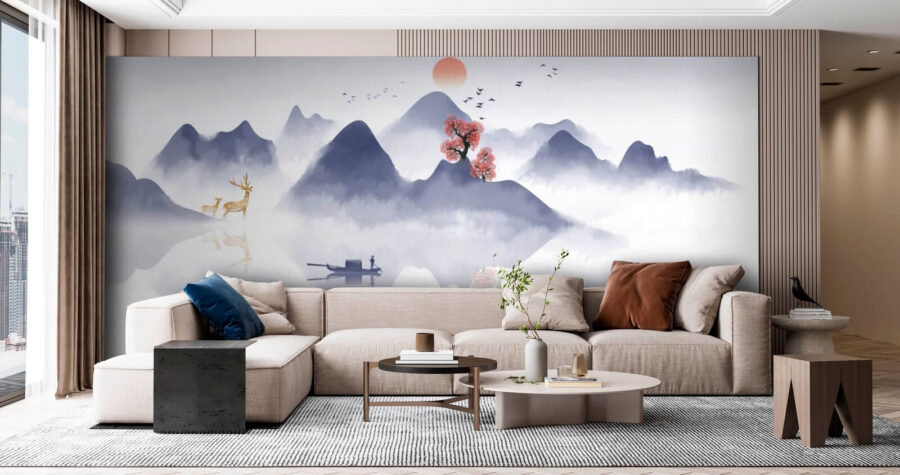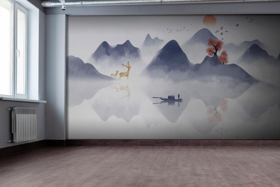 Verander elke kamer in een serene toevluchtsoord met deze prachtige muurschildering. Met een rustige boot die door een mistig bos glijdt, omringd door majestueuze bergen en levendige bomen, nodigt het je uit om even weg te dromen. Stel je voor dat je koffie drinkt terwijl de ochtendzon boven de horizon uitkomt en zachte tinten op het water werpt. Het is alsof je elke keer dat je erlangs loopt een minivakantie beleeft. Perfect voor die gezellige hoekjes of een kantoor dat wel wat zen-vibes kan gebruiken. Bovendien is er een hert te zien – want wie wil er nu niet een beetje wildlife spotten zonder het huis te verlaten? Omarm die natuurlijke charme!