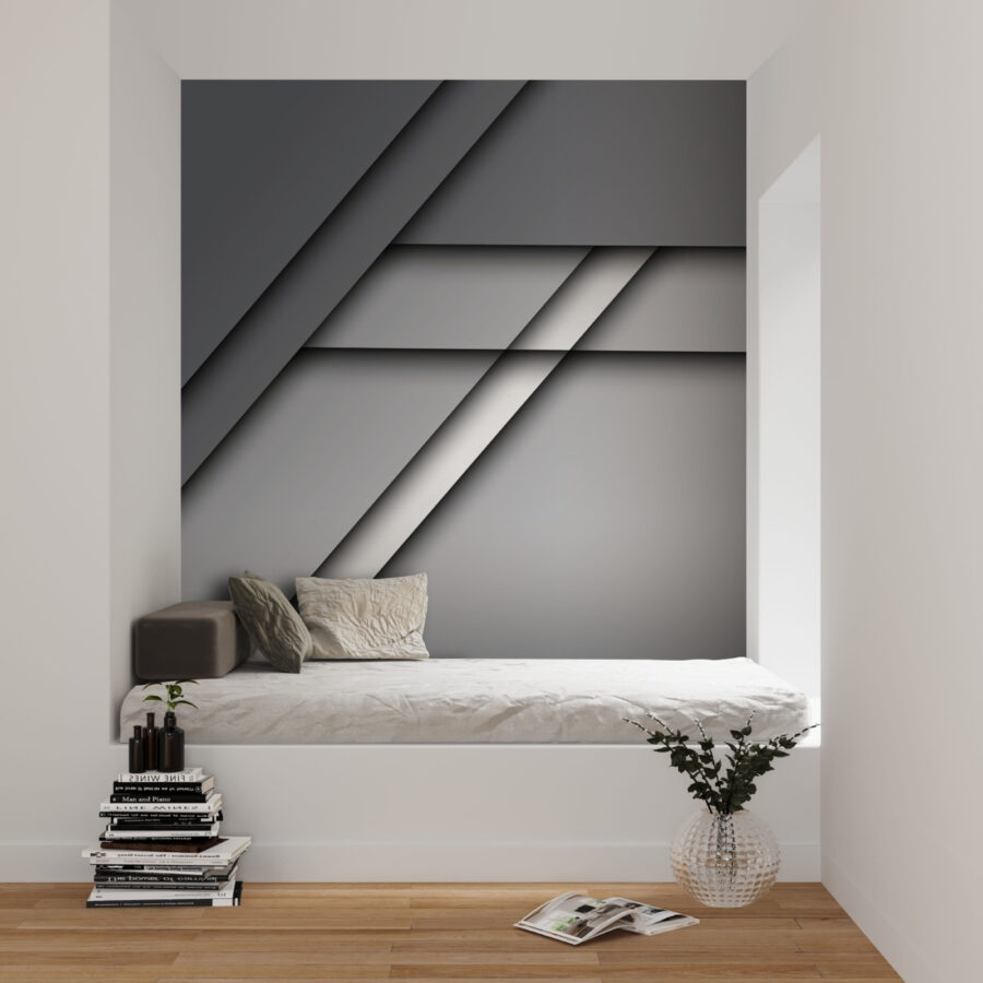 Verander een kale muur in een stijlvolle conversatiestarter met deze opvallende muurschildering. Het rijke samenspel van grijs en wit creëert een geraffineerde achtergrond die allesbehalve saai is. Of het nu in een gezellige woonkamer is of in een chique kantoor, deze muurschildering verhoogt op subtiele wijze de sfeer. Stel je voor dat je koffie drinkt terwijl je je koestert in de kalmte die het met zich meebrengt, zoals de omhelzing van een favoriete trui op een kille dag. En hij past perfect bij een vleugje kleurrijk meubilair of planten. Wie wist dat een eenvoudig ontwerp zo verfrissend kon aanvoelen? Het draait allemaal om het creëren van een ruimte die precies goed voelt.