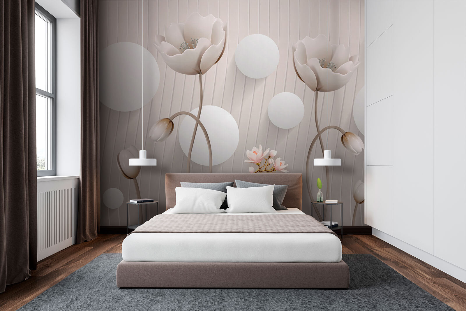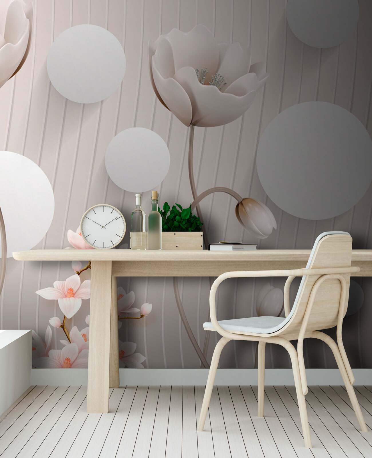 Transformeer elke ruimte met deze prachtige muurschildering met delicate bloemen en speelse cirkels. Stel je voor dat je een kamer binnenstapt waar zachte bloemen uitnodigen tot rust en charme. Het is als een zachte bries na een lange dag, die je omhult met warmte en gemak. Perfect om een gezellig leeshoekje op te fleuren of een saaie gang mee op te vrolijken. Deze subtiele kleuren passen naadloos bij bijna elke interieurstijl, waardoor het moeiteloos stijlvol aanvoelt. Gasten zullen denken dat je een ontwerper hebt ingehuurd. Bovendien herinnert het je eraan dat het leven te kort is om niet een beetje schoonheid toe te voegen.
