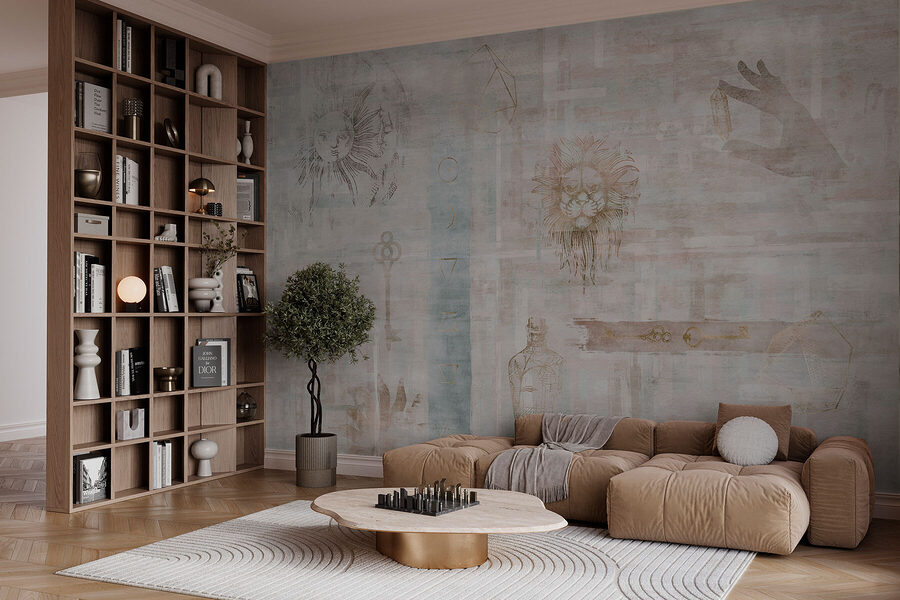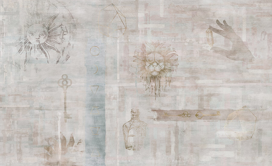 Met deze muurschildering wordt het een stuk intrigerender om je ruimte te transformeren. Stel je voor: verschillende symbolen en speelse ontwerpen creëren een achtergrond vol verhalen die wachten om zich te ontvouwen. Een leeuwengezicht staart je aan, terwijl mysterieuze vormen geheimen fluisteren. Stel je voor dat je koffie drinkt in een kamer waar deze muurschildering een gesprek op gang brengt en een gewone middag verandert in een heerlijk eigenzinnige escapade. Het is alsof je een kunstwerk hebt dat leeft en je uitnodigt om in gedachten te verzonken te raken. Perfect voor mensen die houden van een vleugje eigenzinnigheid in hun huis, want wie wil er nou niet een beetje avontuur aan de muur?
