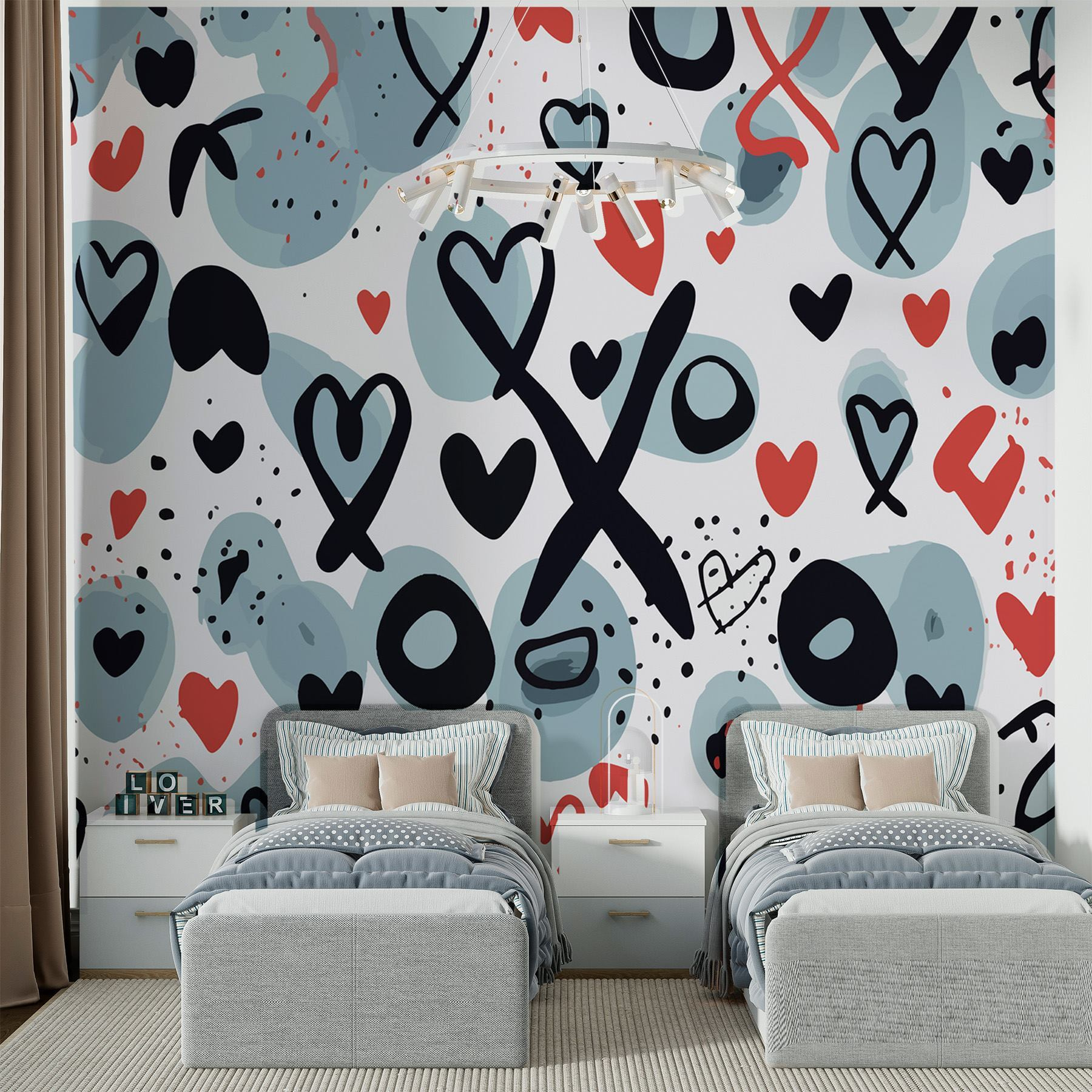 Verander elke saaie muur in een vrolijk oase met dit “Muurschilderingen Patroon van Harten en Symbolen”. Stel je voor dat je een kamer binnenloopt en meteen die warme, fuzzy vibe voelt. De speelse mix van harten, kusjes en funky symbolen danst over de muur en fluistert lieve woordjes naar iedereen die binnenkomt. Deze muurschildering is perfect voor een gezellig hoekje of zelfs een levendige entree en decoreert niet alleen, maar straalt ook vreugde uit.