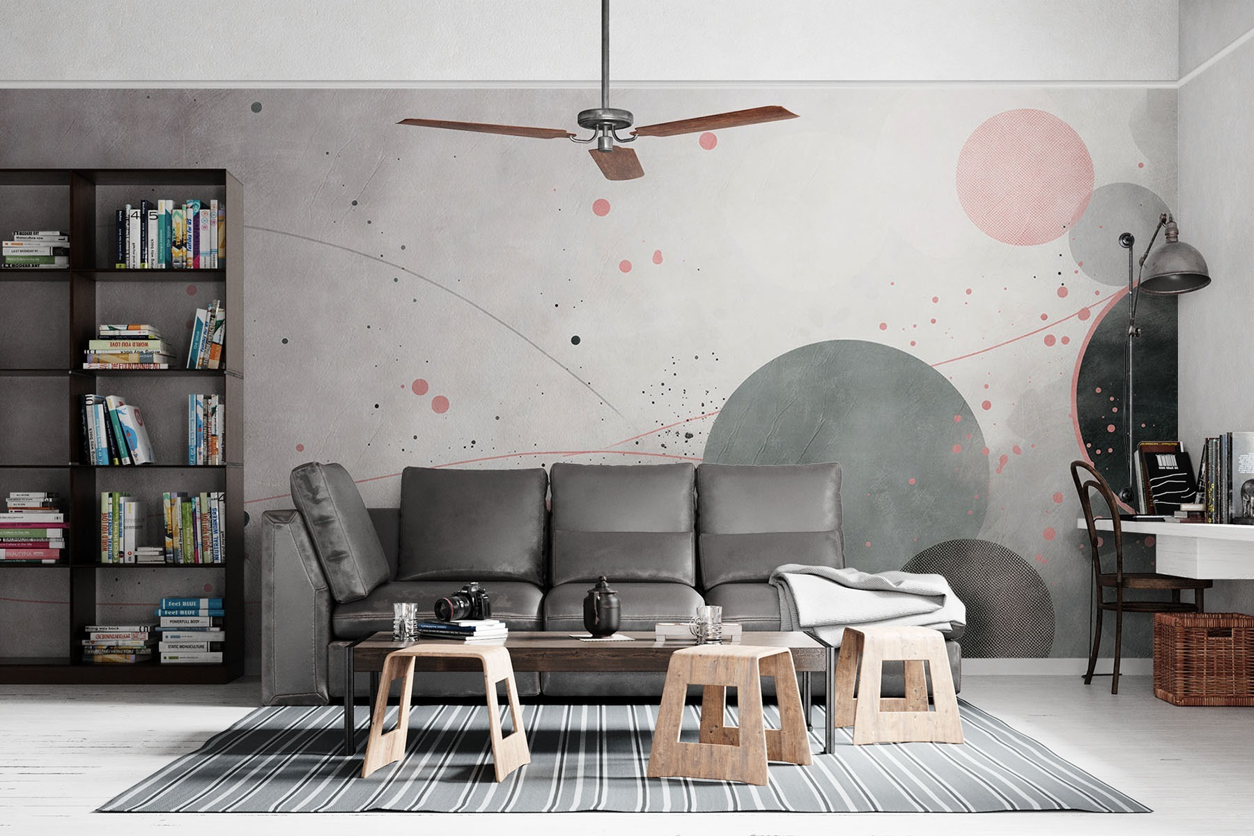 Transformeer je ruimte met deze prachtige muurschildering met grijze en roze cirkels en grillige lijnen. Het combineert moeiteloos een eigentijdse stijl met een vleugje speelse charme, waardoor elke kamer fris en uitnodigend aanvoelt. Stel je voor dat je aan je koffie nipt terwijl je de zachte kleurenvibes in je opneemt, of dat je tot rust komt na een lange dag en de stress voelt wegebben. Het is als een zachte knuffel voor je muren, perfect voor een gezellige woonkamer of een chique kantoor. Deze muurschildering is niet alleen decor; het is een gespreksstarter – wie wil er nu niet praten over die opvallende cirkels? Geloof me, het voegt iets speciaals toe aan je huis.