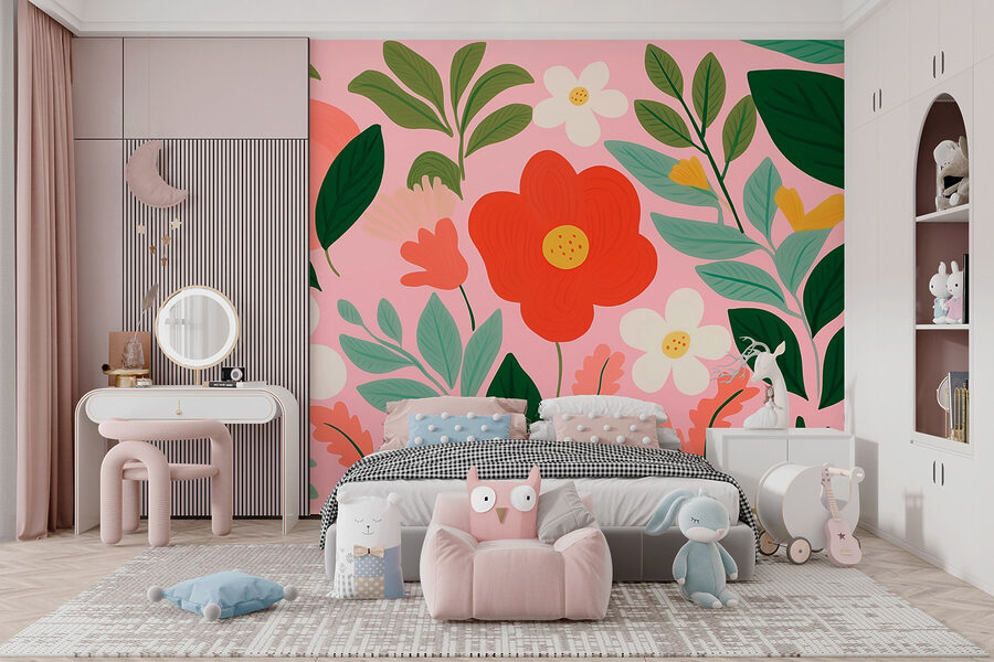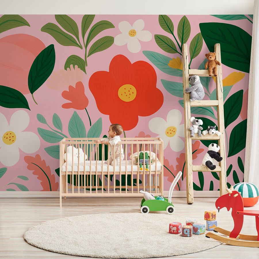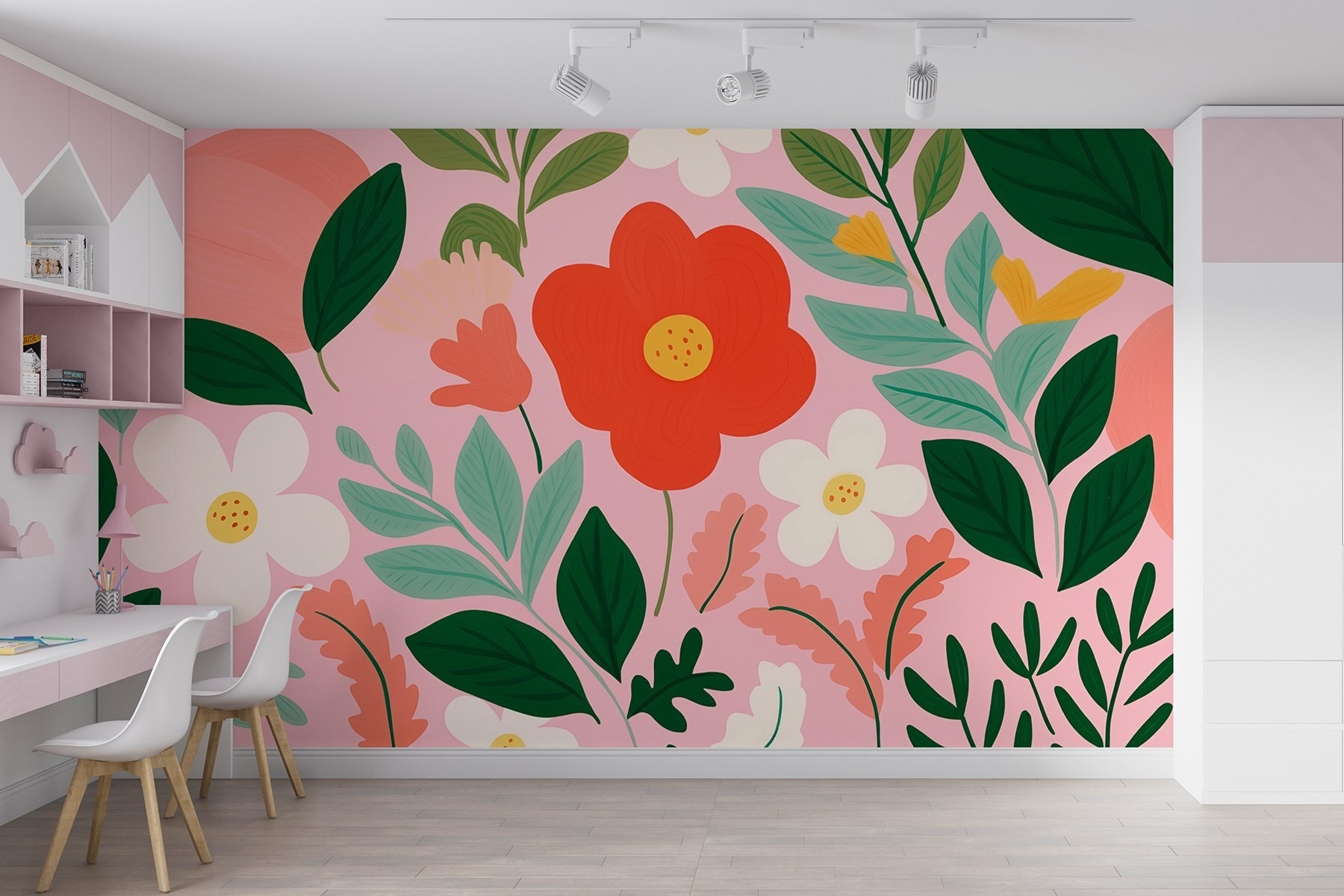 Tover elke kamer om in een bloeiend paradijs met deze levendige muurschildering van bloemen en bladeren. Het vrolijke palet danst met levendig rood, zacht roze en fris groen, waardoor het het hele jaar door lente lijkt. Stel je voor dat je thuis zit te loungen, omringd door deze uitbarsting van natuur, en plotseling word je getransporteerd naar een zonnige tuin, compleet met grillige bloemen die je lijken op te vrolijken. Deze muurschildering is perfect om een woonkamer op te fleuren of een gezellig leeshoekje te creëren en is als een knuffel van de natuur. Stel je voor: nippend aan de koffie, de vrolijke sfeer bewonderend en misschien dagdromend over je volgende avontuur in de natuur.