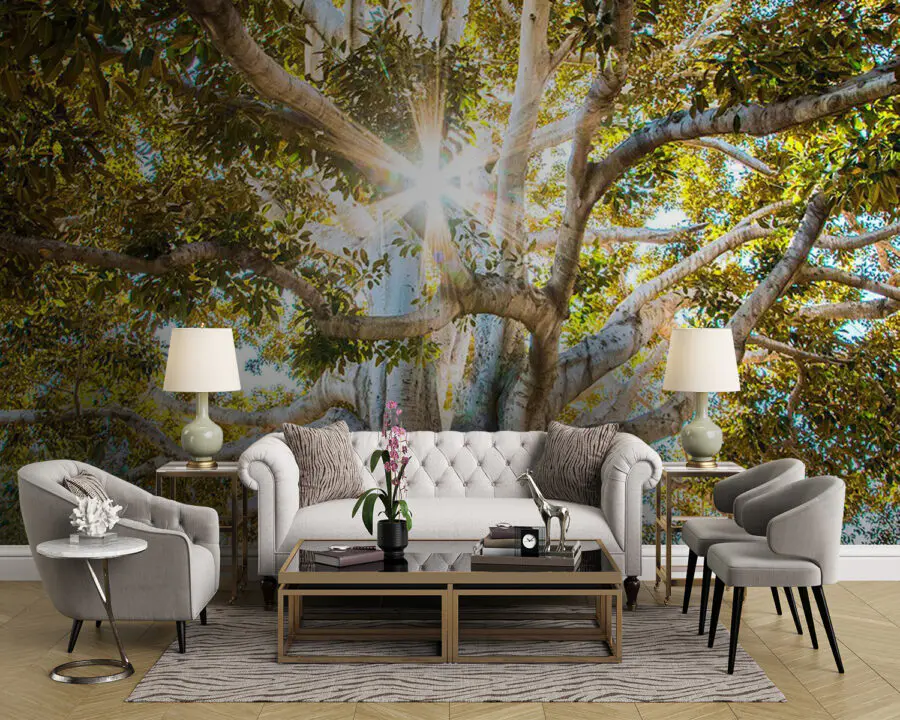 Transform your space with the “Majestic Tree Capturing Sunlight’s Essence” mural. This isn’t just a bunch of leaves; it’s a doorway into a tranquil forest where sunlight plays peekaboo through vibrant greenery. Imagine walking into your room and feeling that warm, calming glow wash over you—like a hug from nature.