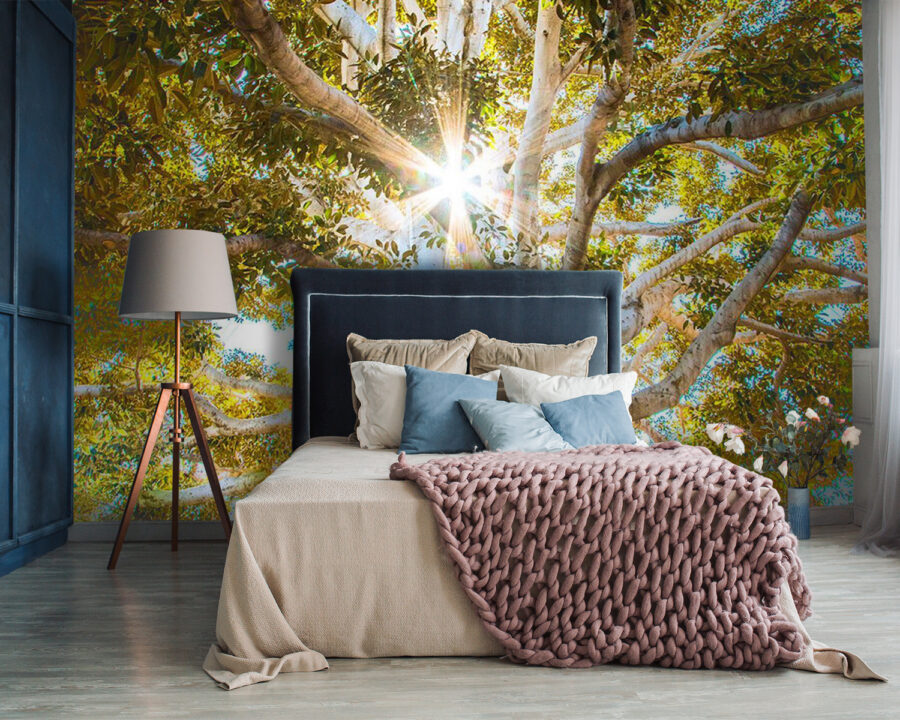 Transformeer uw ruimte met de muurschildering ‘Majestic Tree Capturing Sunlight’s Essence’. Dit is niet zomaar een bos bladeren; het is een poort naar een rustig bos waar het zonlicht door het levendige groen speelt. Stel u voor dat u uw kamer binnenloopt en die warme, rustgevende gloed over u heen voelt komen – als een knuffel van de natuur.