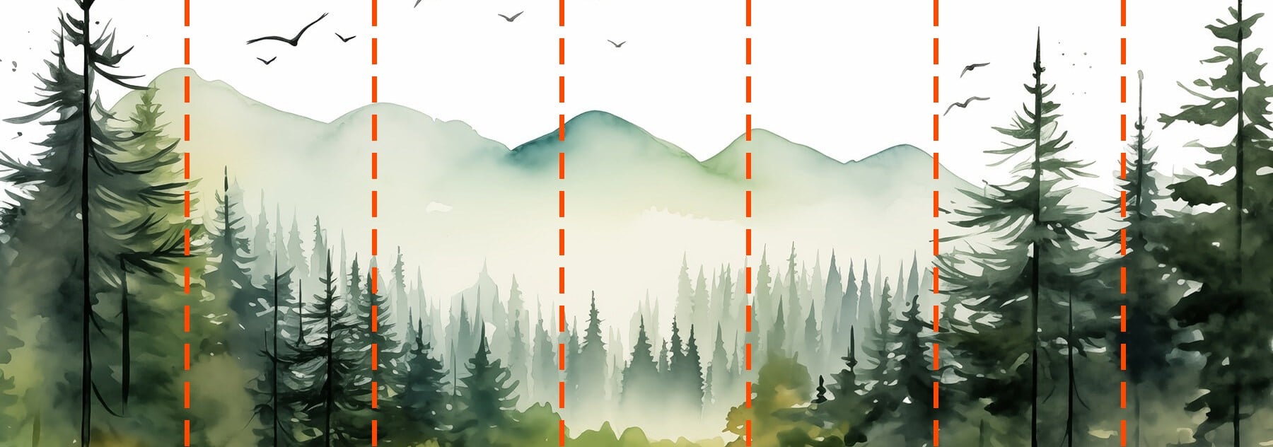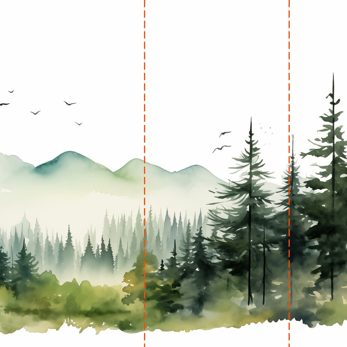 Fotobehang Aquarel van een bos en bergen