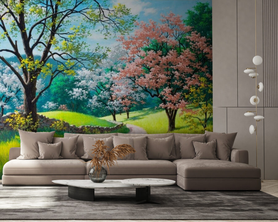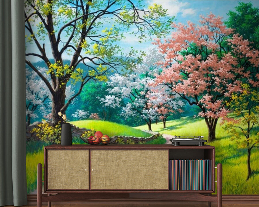 Stel je voor dat je elke keer dat je je kamer binnenkomt, een serene ontsnapping beleeft. Deze muurschildering, “Dirt Road Through a Grassy Field with Trees” (Onverharde weg door een grasveld met bomen), geeft dat gevoel perfect weer. Je kunt bijna het zachte ruisen van bladeren en het zachte getjilp van vogels in de verte horen. Met levendige groentinten en speelse accenten van roze en witte bloesems nodigt het uit tot dagdromen over ontspannen wandelingen langs een zonovergoten pad. Perfect voor een gezellige woonkamer of een rustige slaapkamer, het brengt de natuur naar binnen – tuinhandschoenen zijn niet nodig! Hang het op, haal diep adem en laat je ruimte aanvoelen als een heerlijk toevluchtsoord. Echt, wie heeft er nog vakantie nodig als je muren dat ook kunnen?