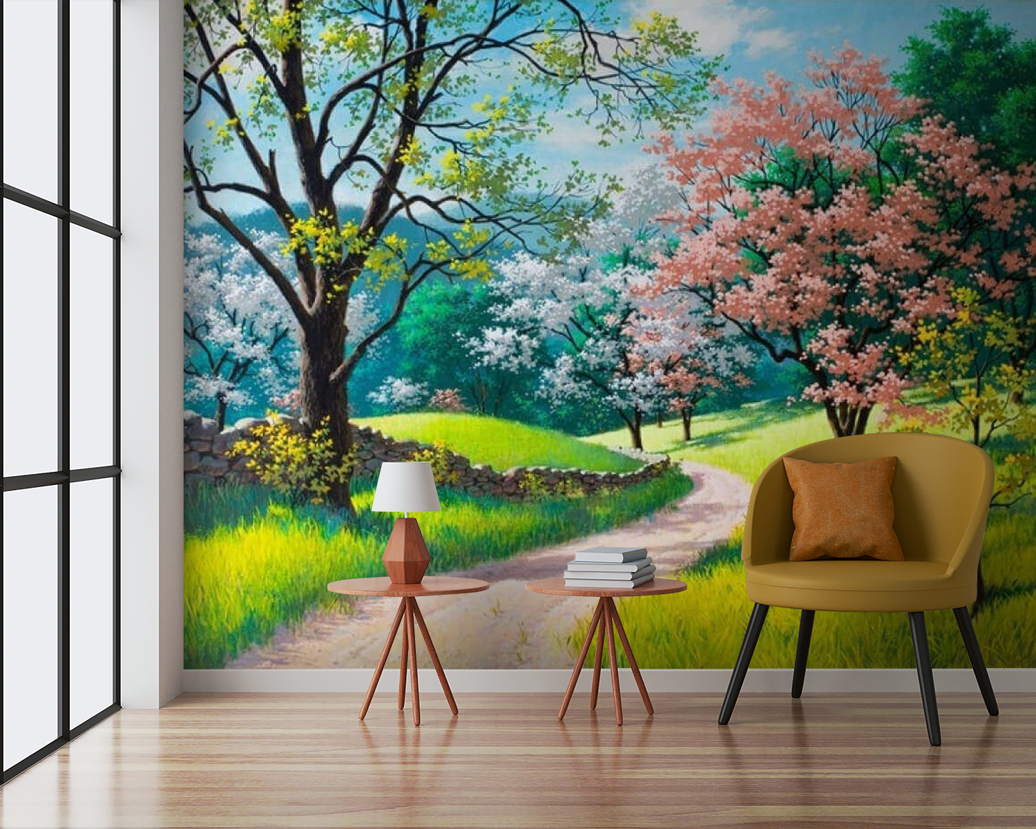 Stel je voor dat je elke keer dat je je kamer binnenkomt, een serene ontsnapping beleeft. Deze muurschildering, “Dirt Road Through a Grassy Field with Trees” (Onverharde weg door een grasveld met bomen), geeft dat gevoel perfect weer. Je kunt bijna het zachte ruisen van bladeren en het zachte getjilp van vogels in de verte horen. Met levendige groentinten en speelse accenten van roze en witte bloesems nodigt het uit tot dagdromen over ontspannen wandelingen langs een zonovergoten pad. Perfect voor een gezellige woonkamer of een rustige slaapkamer, het brengt de natuur naar binnen – tuinhandschoenen zijn niet nodig! Hang het op, haal diep adem en laat je ruimte aanvoelen als een heerlijk toevluchtsoord. Echt, wie heeft er nog vakantie nodig als je muren dat ook kunnen?