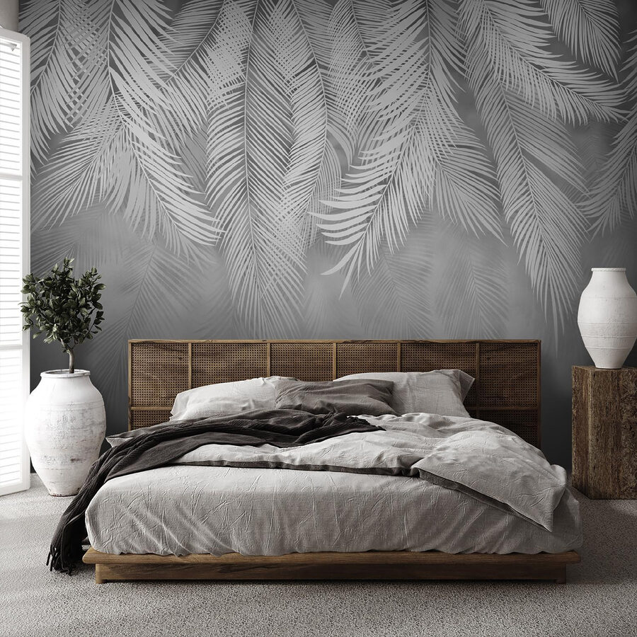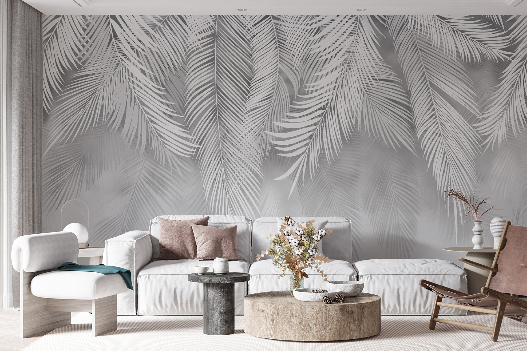 Fotobehang Fotobehang Elegant zilveren palmbladerenontwerp (SKU: u48556v7)
