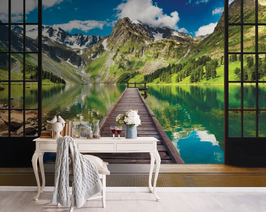 Deze muurschildering staat niet voor niets in de categorie “Look OUT the Window Fotobehang”; het voelt letterlijk alsof je uit een hutje aan het meer kijkt. De levendige kleuren, de dromerige weerspiegeling op het water – het is een instant mood-lifter. Zie jezelf al liggen met een kopje koffie en laat je gedachten afdwalen naar dat vredige meer. Plus, het is een geweldige gespreksstarter. Wees alleen niet verbaasd als vrienden vragen naar de details van je “vakantieplek”!