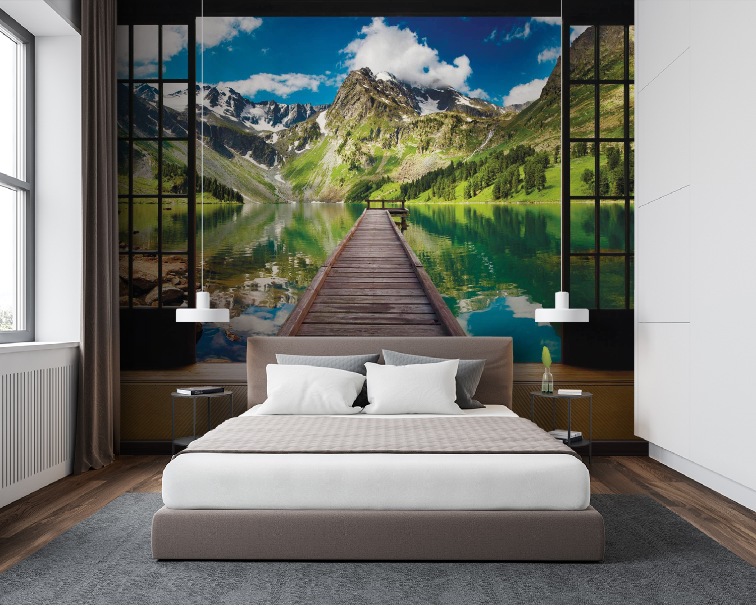 Deze muurschildering staat niet voor niets in de categorie “Look OUT the Window Fotobehang”; het voelt letterlijk alsof je uit een hutje aan het meer kijkt. De levendige kleuren, de dromerige weerspiegeling op het water – het is een instant mood-lifter. Zie jezelf al liggen met een kopje koffie en laat je gedachten afdwalen naar dat vredige meer. Plus, het is een geweldige gespreksstarter. Wees alleen niet verbaasd als vrienden vragen naar de details van je “vakantieplek”!