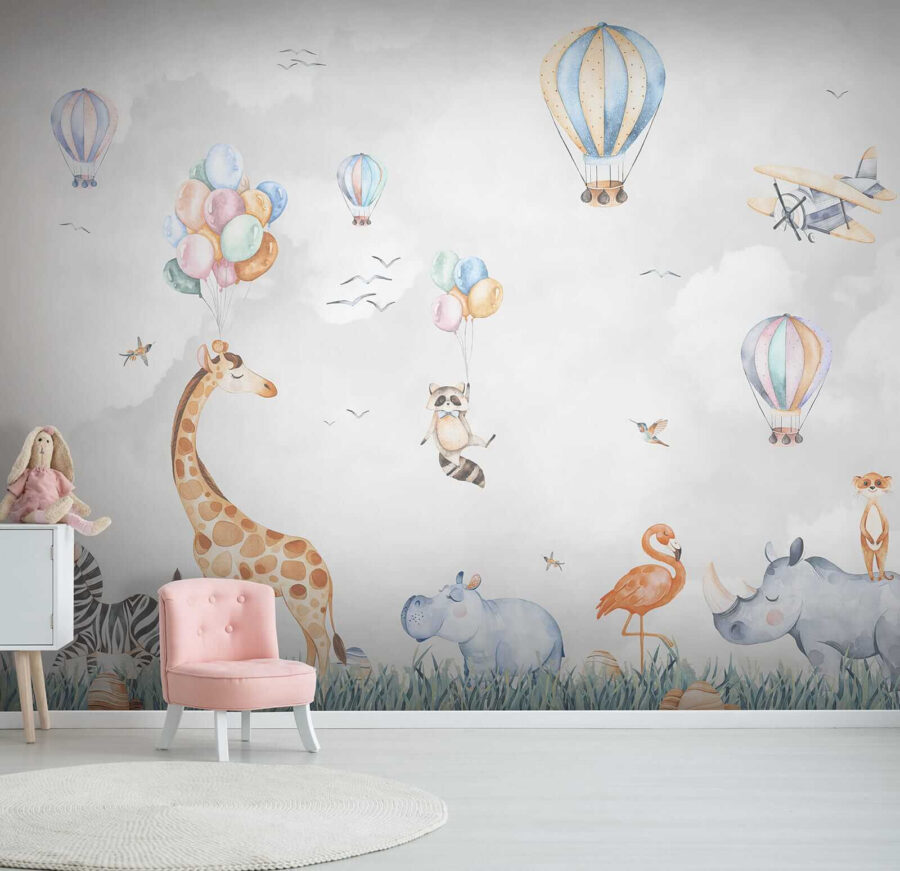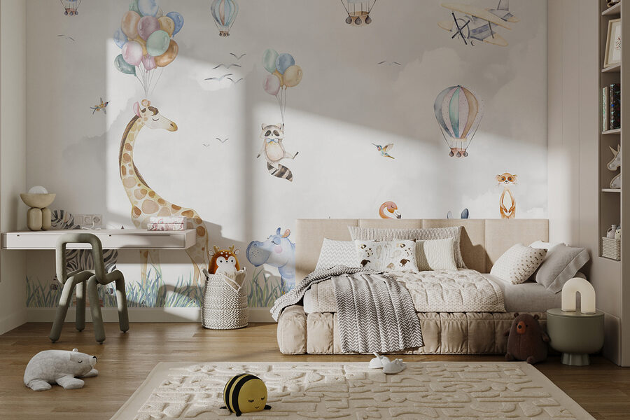 Hier is een vleugje eigenzinnigheid voor de ruimte van je kind! De muurschildering “Hippo in the Grass” is een absolute charmeur. Stel je voor dat je een kamer binnenloopt en het gevoel hebt dat je in een magische safari bent – heteluchtballonnen die zweven, dieren zoals giraffen en zebra’s die gewoon chillen in hoge grasvelden. Zelfs een brutale wasbeer die ballonnen vasthoudt! Deze muurschildering geeft een levendige, speelse sfeer waar kinderen – en volwassenen – dol op zijn. Perfect voor de kinderkamer, want het stimuleert de verbeelding en het avontuur. Stel je voor dat verhaaltjes voor het slapengaan een heel nieuw decor krijgen, waardoor elke avond een mini-avontuur wordt. En wie wil er nu geen vrolijk nijlpaard in zijn kamer? Zeker een gespreksstarter. Bereid je voor op oohs en ahs van de kleintjes (en de groten ook!). Het is niet alleen decor, het is vrolijkheid aan de muur.