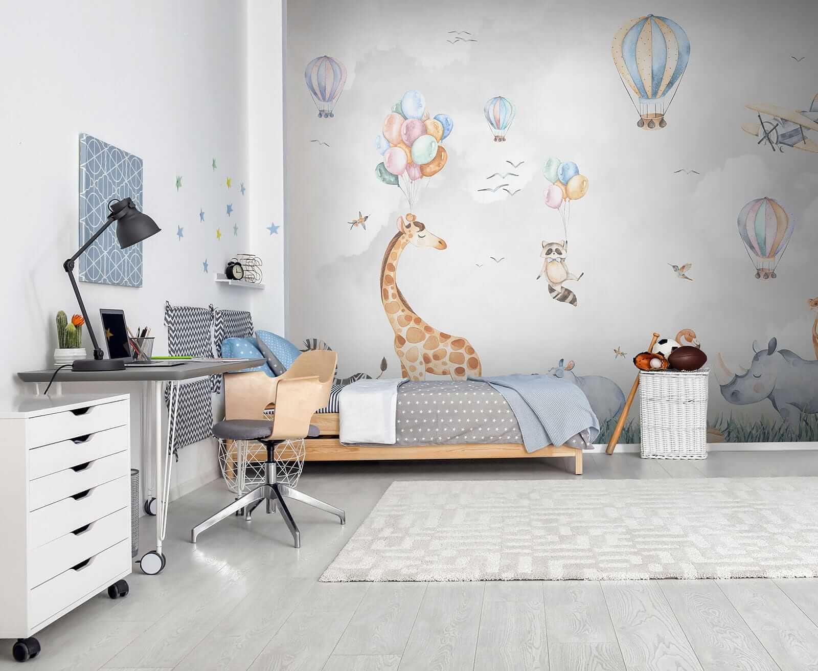 Hier is een vleugje eigenzinnigheid voor de ruimte van je kind! De muurschildering “Hippo in the Grass” is een absolute charmeur. Stel je voor dat je een kamer binnenloopt en het gevoel hebt dat je in een magische safari bent – heteluchtballonnen die zweven, dieren zoals giraffen en zebra’s die gewoon chillen in hoge grasvelden. Zelfs een brutale wasbeer die ballonnen vasthoudt! Deze muurschildering geeft een levendige, speelse sfeer waar kinderen – en volwassenen – dol op zijn. Perfect voor de kinderkamer, want het stimuleert de verbeelding en het avontuur. Stel je voor dat verhaaltjes voor het slapengaan een heel nieuw decor krijgen, waardoor elke avond een mini-avontuur wordt. En wie wil er nu geen vrolijk nijlpaard in zijn kamer? Zeker een gespreksstarter. Bereid je voor op oohs en ahs van de kleintjes (en de groten ook!). Het is niet alleen decor, het is vrolijkheid aan de muur.
