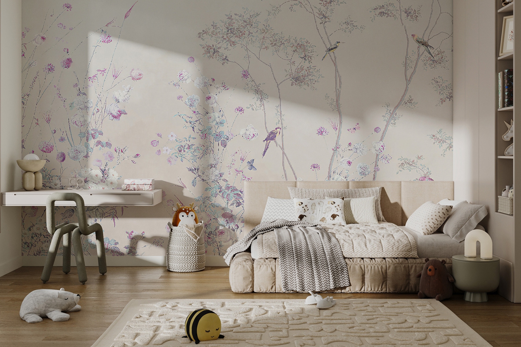 Deze muurschildering “Pastelbloemen en vogels in harmonie” is als een zachte, dromerige melodie voor je muren. Stel je voor dat je je ruimte vult met bloesems en delicate vogels, allemaal in rustgevende pasteltinten. Het is perfect voor iedereen die van de schoonheid van de natuur houdt en een vleugje van het buitenleven naar binnen wil halen zonder te maken te hebben met, je weet wel, echt vuil of insecten. Het kan precies het juiste zijn om een saaie kamer om te toveren in een lieflijk toevluchtsoord. Door de zachte kleuren en het rustgevende tafereel waan je je in een betoverende tuin. Perfect voor een slaapkamer of een gezellig leeshoekje waar je de hele middag kunt wegdromen. En wie wil er nu niet elke ochtend wakker worden met een veld vol bloemen en het gezelschap van kleine vogeltjes?