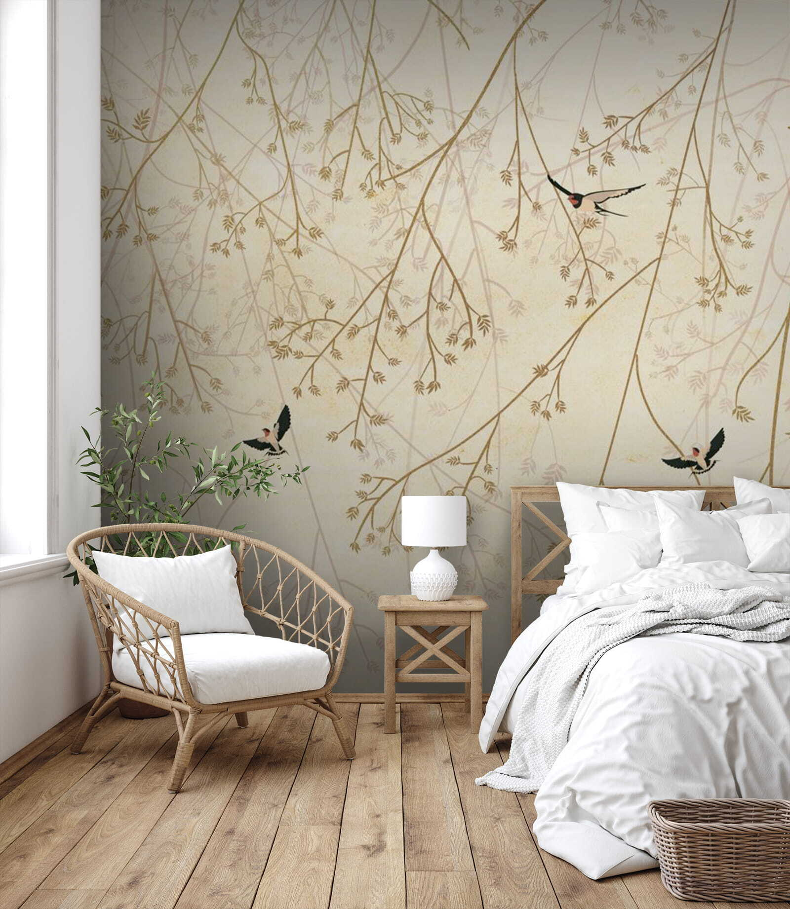 Stel je een luie zondagochtend voor, nippend aan een kopje koffie en een zacht briesje – deze muurschildering van vogels die door takken vliegen brengt precies die sfeer in je kamer. Het is alsof je een stukje rust van de natuur aan je muur hebt hangen. De zachte, aardse tinten passen moeiteloos in elk interieur, waardoor je kamer knus en uitnodigend aanvoelt.