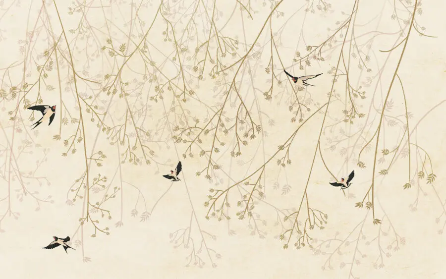 Stel je een luie zondagochtend voor, nippend aan een kopje koffie en een zacht briesje – deze muurschildering van vogels die door takken vliegen brengt precies die sfeer in je kamer. Het is alsof je een stukje rust van de natuur aan je muur hebt hangen. De zachte, aardse tinten passen moeiteloos in elk interieur, waardoor je kamer knus en uitnodigend aanvoelt.