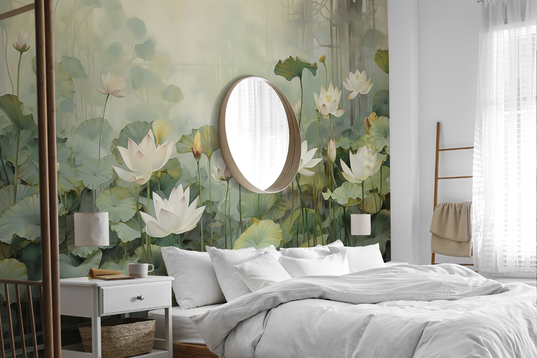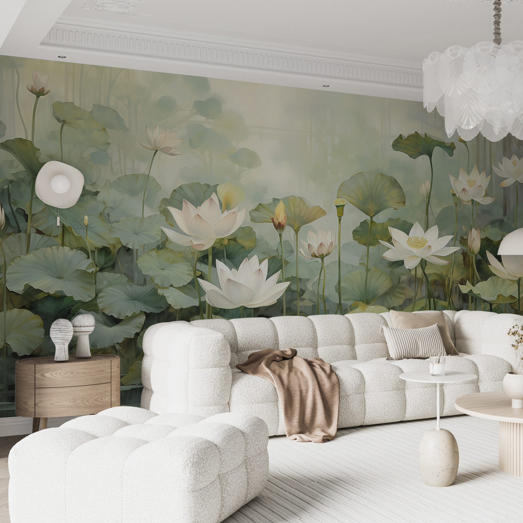 Stel je voor dat je een sereen toevluchtsoord binnenstapt met deze betoverende muurschildering van een rustige vijver, bezaaid met delicate bloesems en omringd door weelderig groen. Het is alsof je een vredig toevluchtsoord in huis haalt. De zachte tinten nodigen je uit om even stil te staan en adem te halen, en roepen het gevoel op van een luie namiddag aan een rustig meer. Stel je voor: een kopje thee en een goed boek in de hand, verdwaald in de schoonheid van de natuur zonder ooit de kamer te verlaten. Deze muurschildering is ideaal voor een gezellige woonruimte of een rustig leeshoekje en fluistert ontspanning en een vleugje eigenzinnigheid in, waardoor elke muur aanvoelt als een venster naar een magische tuin.