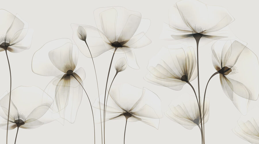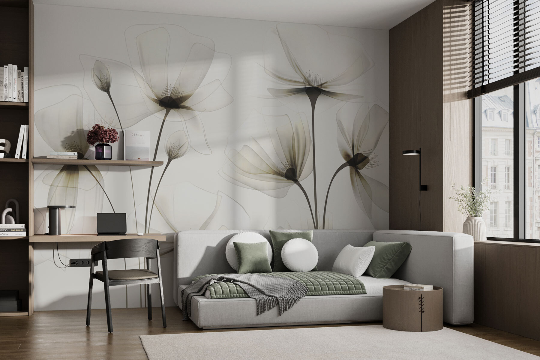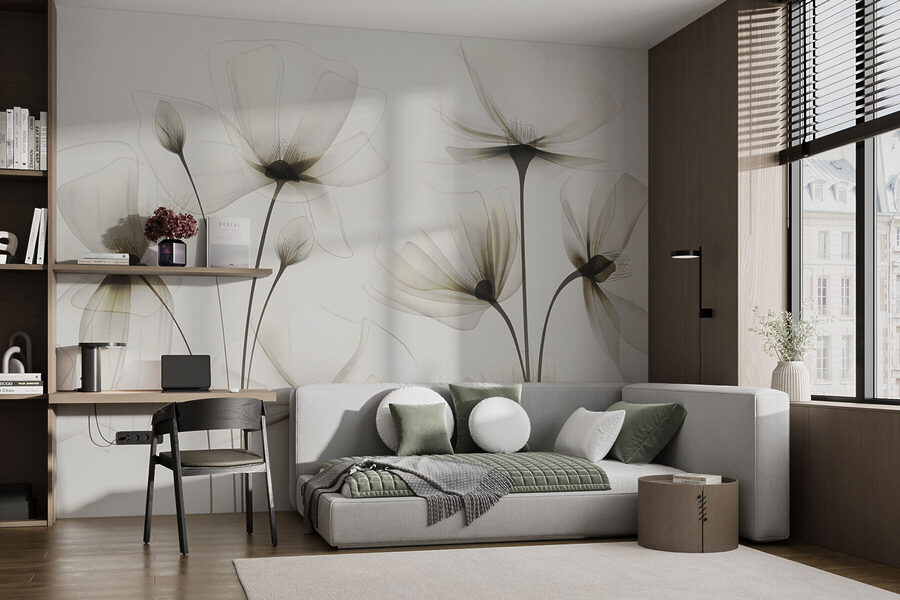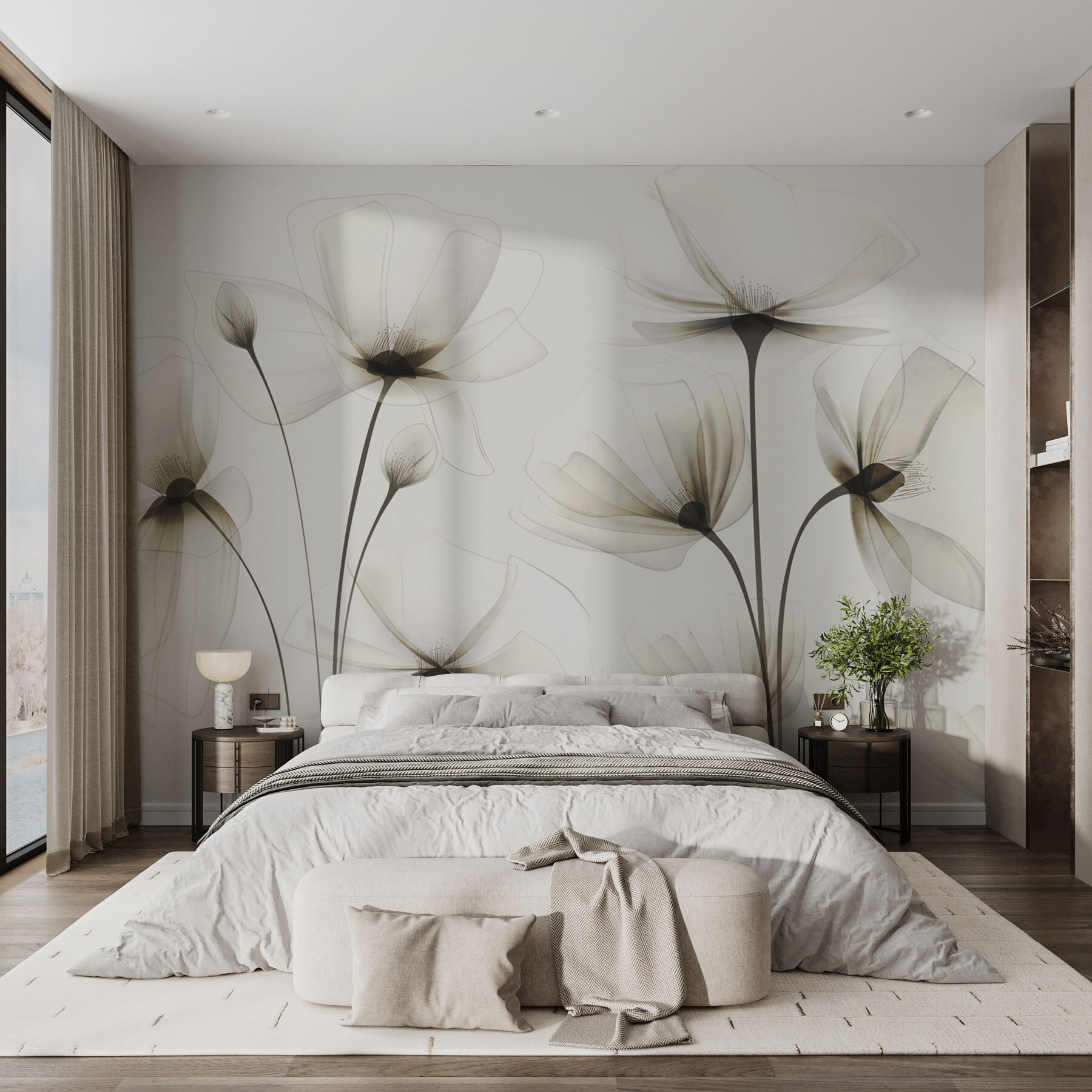 Heb je het gevoel dat je muren wel wat magie kunnen gebruiken? Kijk dan eens naar deze muurschildering met deze oh-zo-delicate bloemen die bijna in de lucht lijken te zweven. De zachte, transparante bloemblaadjes op een strakke witte achtergrond geven zo’n serene, rustgevende sfeer. Stel je voor dat je elke dag wakker wordt met deze schoonheid, alsof je je eigen rustige tuin hebt zonder al het water geven.