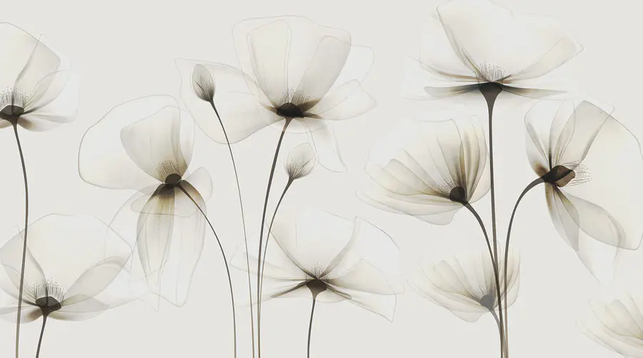 Heb je het gevoel dat je muren wel wat magie kunnen gebruiken? Kijk dan eens naar deze muurschildering met deze oh-zo-delicate bloemen die bijna in de lucht lijken te zweven. De zachte, transparante bloemblaadjes op een strakke witte achtergrond geven zo’n serene, rustgevende sfeer. Stel je voor dat je elke dag wakker wordt met deze schoonheid, alsof je je eigen rustige tuin hebt zonder al het water geven.