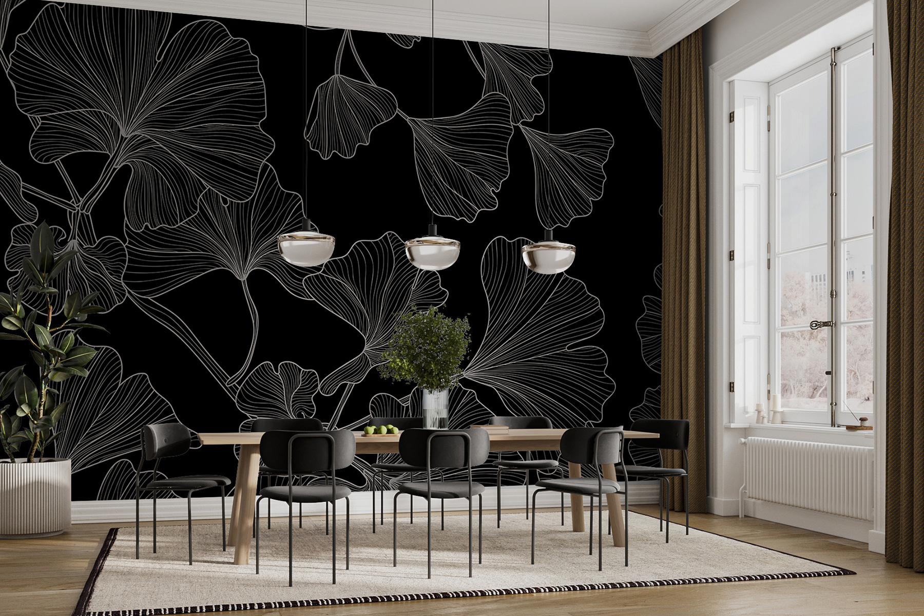 Transformeer je ruimte met deze prachtige muurschildering met een elegant ginkgo-patroon dat zeker in het oog springt. Zie het voor je – die sierlijke bladeren die tegen een diepzwarte achtergrond dwarrelen en meteen charme en een vleugje natuur toevoegen aan elke kamer. Het is alsof je een frisse wind door de kamer laat waaien, zonder de pollen natuurlijk. Stel je gezellige avonden voor met het bewonderen van dit prachtige ontwerp, misschien met een warme kop thee. Het is perfect voor iedereen die een unieke draai aan zijn interieur wil geven. Vertrouw op de ginkgo om een beetje rust en artisticiteit naar je muren te brengen!