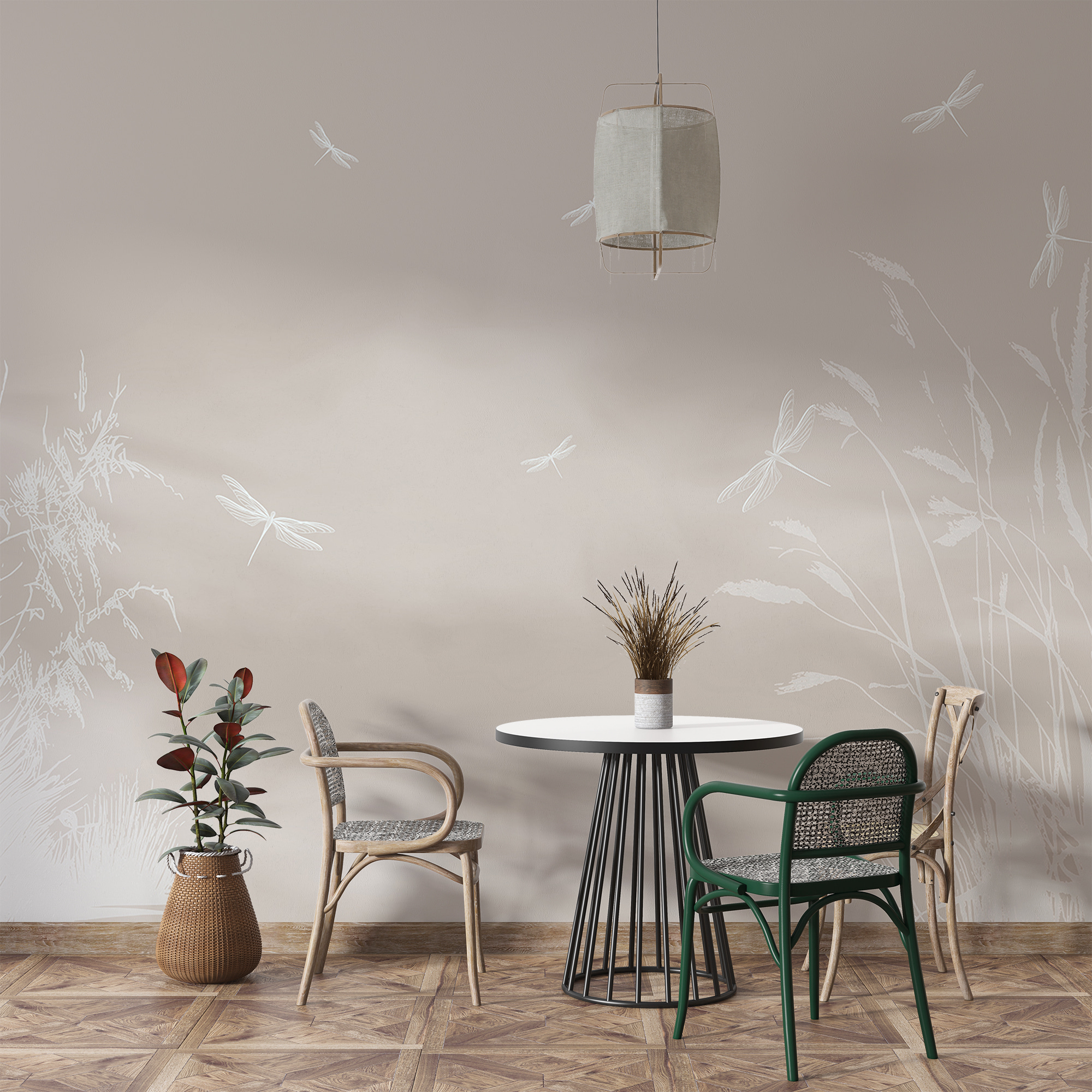 Iets dromerigs nodig voor je muur? Kijk dan eens naar deze muurschildering. Deze delicate witte libellen fladderen rond op een zachte, aardse achtergrond. Het is net een zachte namiddag in een veld, met libellen die dansen in een licht briesje. Stel je voor dat je in je favoriete stoel zit, kopje thee in de hand, helemaal zen. Het heeft een rustgevende vibe waardoor je diep adem wilt halen en wilt ontspannen. Perfect om een vleugje natuur en rust toe te voegen aan je interieur! Geloof me, je zult er elke keer als je langsloopt in willen verdwalen.