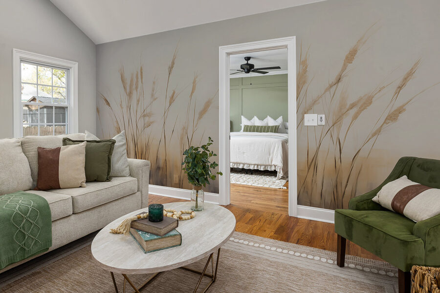 Het is ook perfect om ruimtes groter te laten lijken omdat de zachte, aardse tinten en delicate lijnen er niet zomaar zijn – ze nodigen je uit om dieper te ademen en meer te ontspannen. Het is verbazingwekkend hoe deze muurschildering je ruimte kan veranderen in een sereen toevluchtsoord. Perfect voor je woonkamer, slaapkamer of zelfs een rustig leeshoekje. Stel je voor dat het een gezellig hoekje verlicht met warme, natuurlijke sferen. Alles voelt lichter aan, alsof je zorgen gewoon wegzweven.