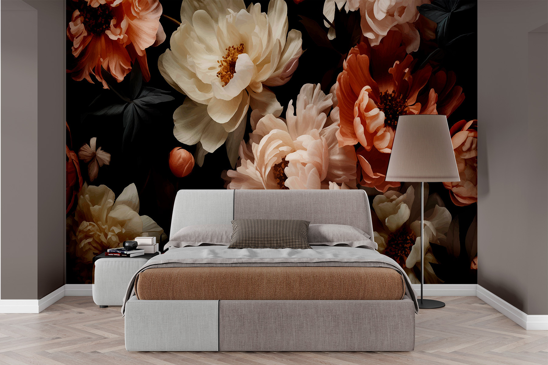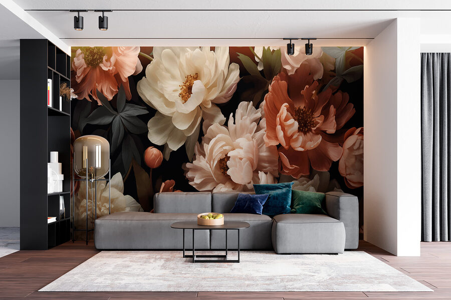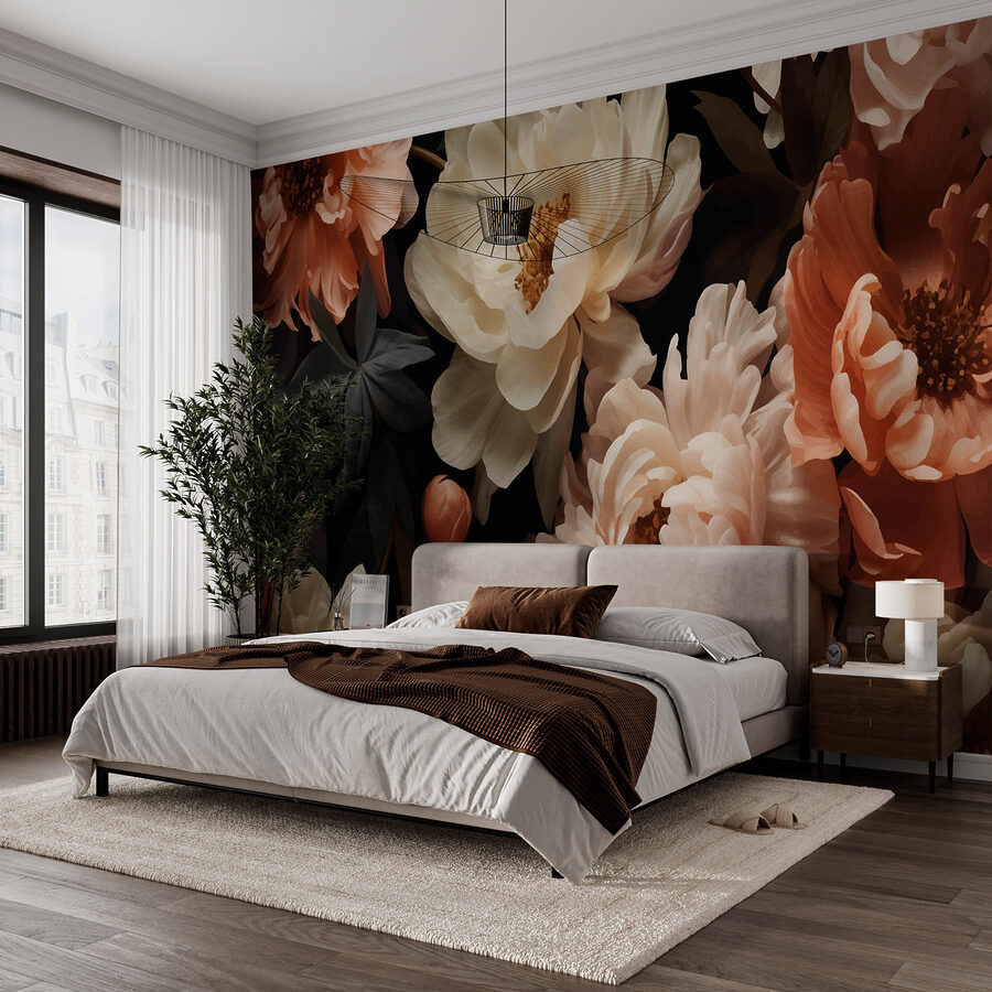 Stel je voor dat je een kamer binnenloopt en begroet wordt door de elegante dans van bloesems tegen een rijke, donkere achtergrond. Deze muurschildering brengt de betovering van een middernachtelijke tuin naar binnen, waar pioenrozen en andere bloemen subtiel wiegen, alsof ze gevangen zijn in een zacht briesje. Het is een fluistering van het drama van de natuur, perfect om een gezellig hoekje te creëren of om een saaie muur om te toveren in een opvallend stuk. De diepe contrasten geven een gevoel van comfort en intrige, alsof je in de schemering een geheime tuin ontdekt, met een gevoel van avontuur en rust tegelijk.