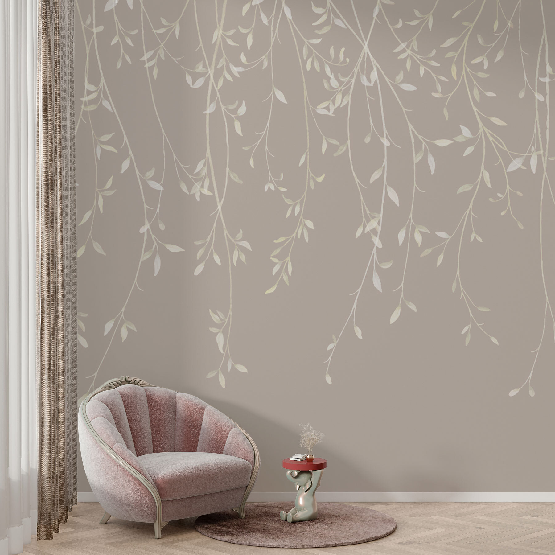 “Delicate bladeren in neutrale tinten” is als het zachte gefluister van de natuur voor je muren. Stel je voor dat je een sereen bos binnenstapt, het soort waar het zonlicht doorheen schijnt en zachte schaduwen werpt. Deze muurschilderingen brengen precies dat gefluister naar je ruimte, rustgevend en aardend. Perfect voor luie zondagen of gewoon een beetje rust in de chaos. Het is net alsof je je eigen stukje rust hebt – water geven is niet nodig! Je kamer wordt meteen een vredige ontsnapping, met een vleugje elegantie dat nooit te luid is, maar precies goed.