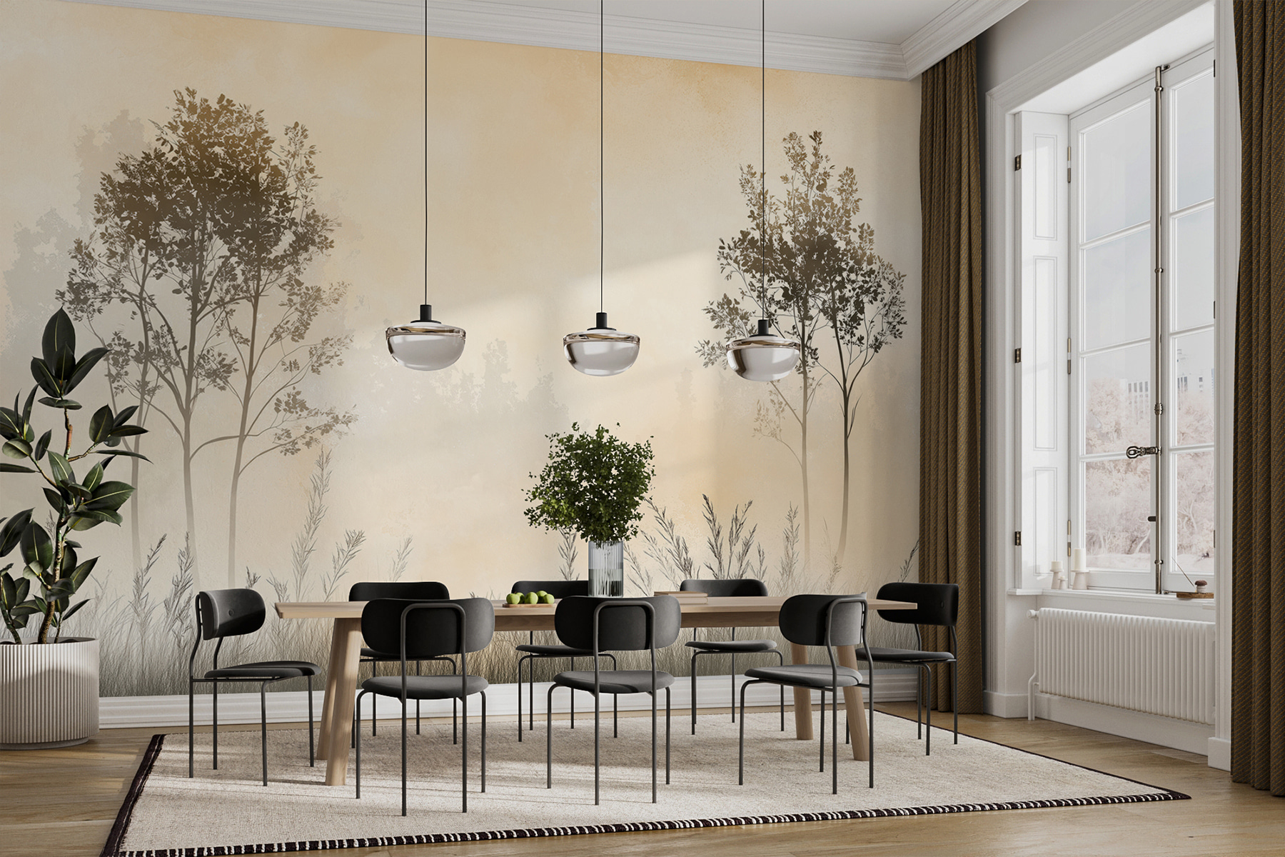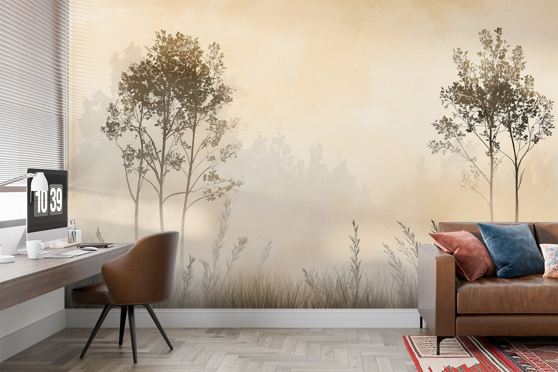 Stel je voor dat je wakker wordt met deze dromerige muurschildering “Mistig landschap met bomen en gras”. Het is alsof je vanuit je woonkamer een sereen bos binnenstapt. Ken je die rustgevende sfeer van een rustige ochtend? Dit legt het perfect vast. De zachte mist hangt rond sierlijke bomen, met een beetje gras erdoorheen. Perfect om een gewone muur om te toveren in je eigen vredige toevluchtsoord.