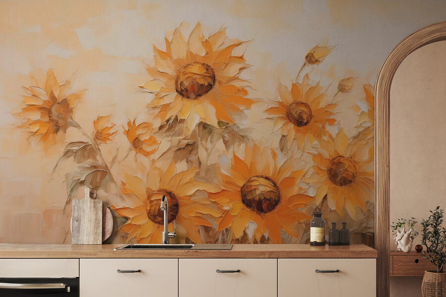 Een kamer omtoveren met deze muurschildering van zonnebloemen voelt als het binnenhalen van een zonnige tuin. Stel je voor dat je wakker wordt met deze levendige bloemen – het is net een vrolijke zonsopgang zonder de vroege wekker. Elke zonnebloem lijkt te dansen in de wind en brengt een vleugje warmte en vreugde naar de muren. Dit kunstwerk is perfect voor een gezellig hoekje of om een saaie gang op te fleuren. Vrienden stoppen misschien wel midden in een gesprek om de felle gelen en zachte tinten te bewonderen. Het is een stukje natuur dat van elke ruimte een vrolijke oase maakt. Hoe opbeurend is dat?