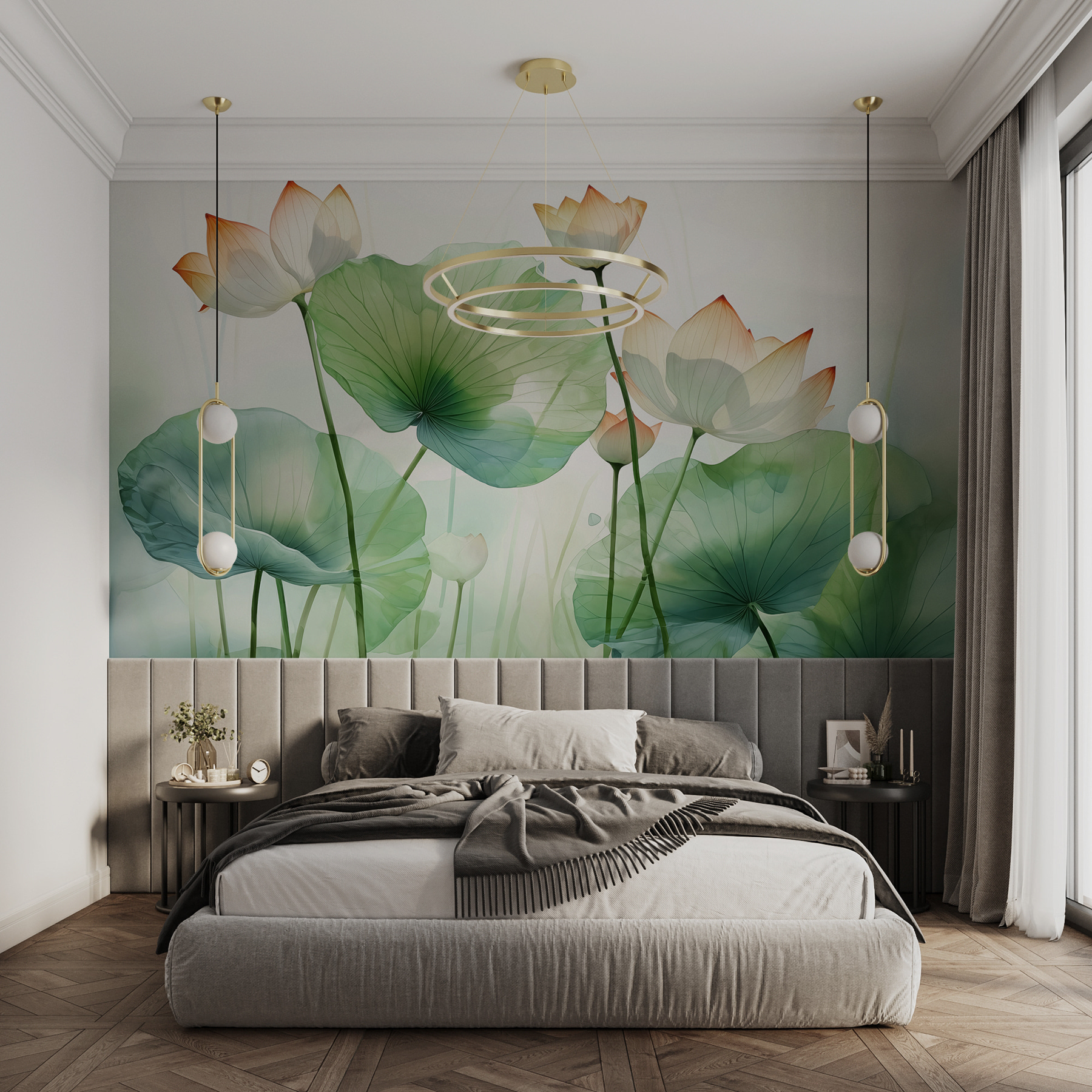 Stel je een zondagochtend voor met een vers kopje koffie en je wordt begroet door deze prachtige muurschildering-“Lotus bloeit in sereen water”. Het is als een kleine vakantie aan een meer voor je muren! Zachte groene en roze tinten spelen met elkaar en voegen een vleugje rust toe aan elke kamer. De lotus, oh zo gracieus, fluistert kalmte telkens als je er langs loopt. Perfect voor als de woonkamer een zacht duwtje in de richting van Zen nodig heeft. Het is niet alleen decor; het is een stemming, een vibe. Wie wist dat de natuur je kon omarmen door alleen maar aan de muur te hangen?
